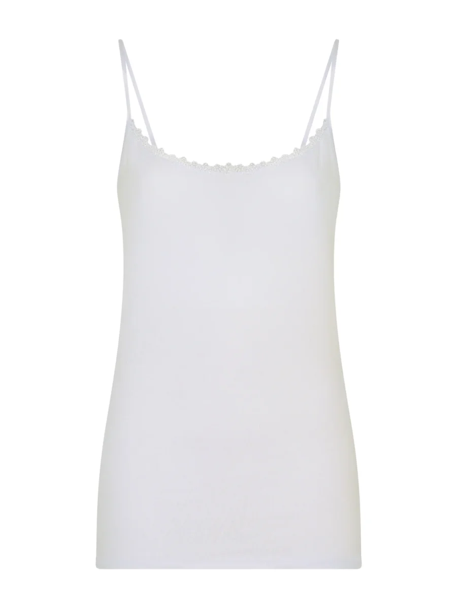 Top in maglia unita di puro cotone con scollo bordato in macramè.