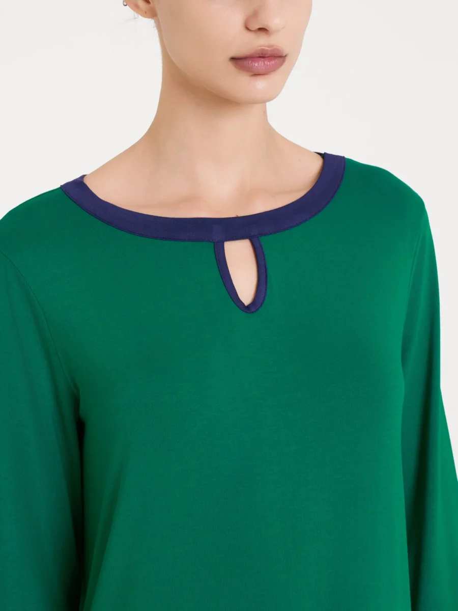 Il bordo sullo scollo a goccia, in base al colore, è tono su tono o a contrasto per delineare delicatamente le forme del corpo.
