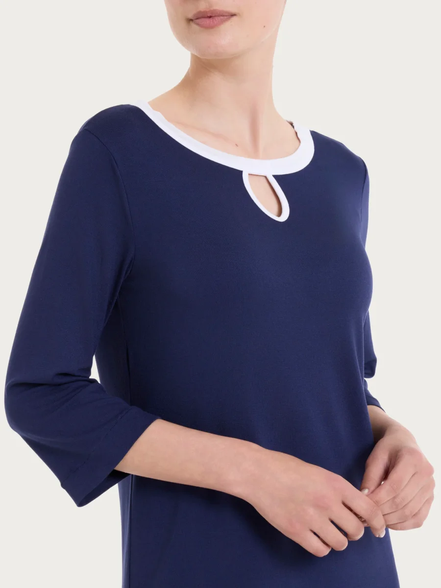 Il bordo sullo scollo a goccia, in base al colore, è tono su tono o a contrasto per delineare delicatamente le forme del corpo.