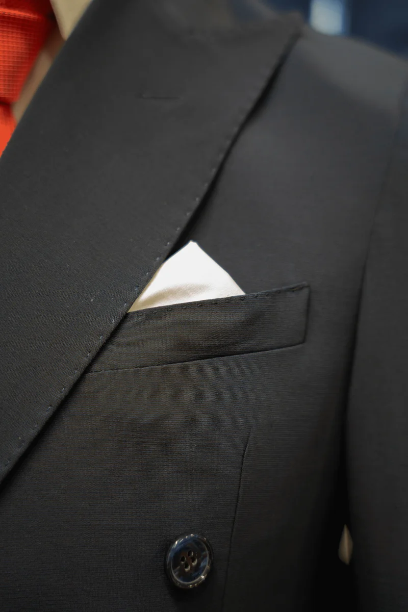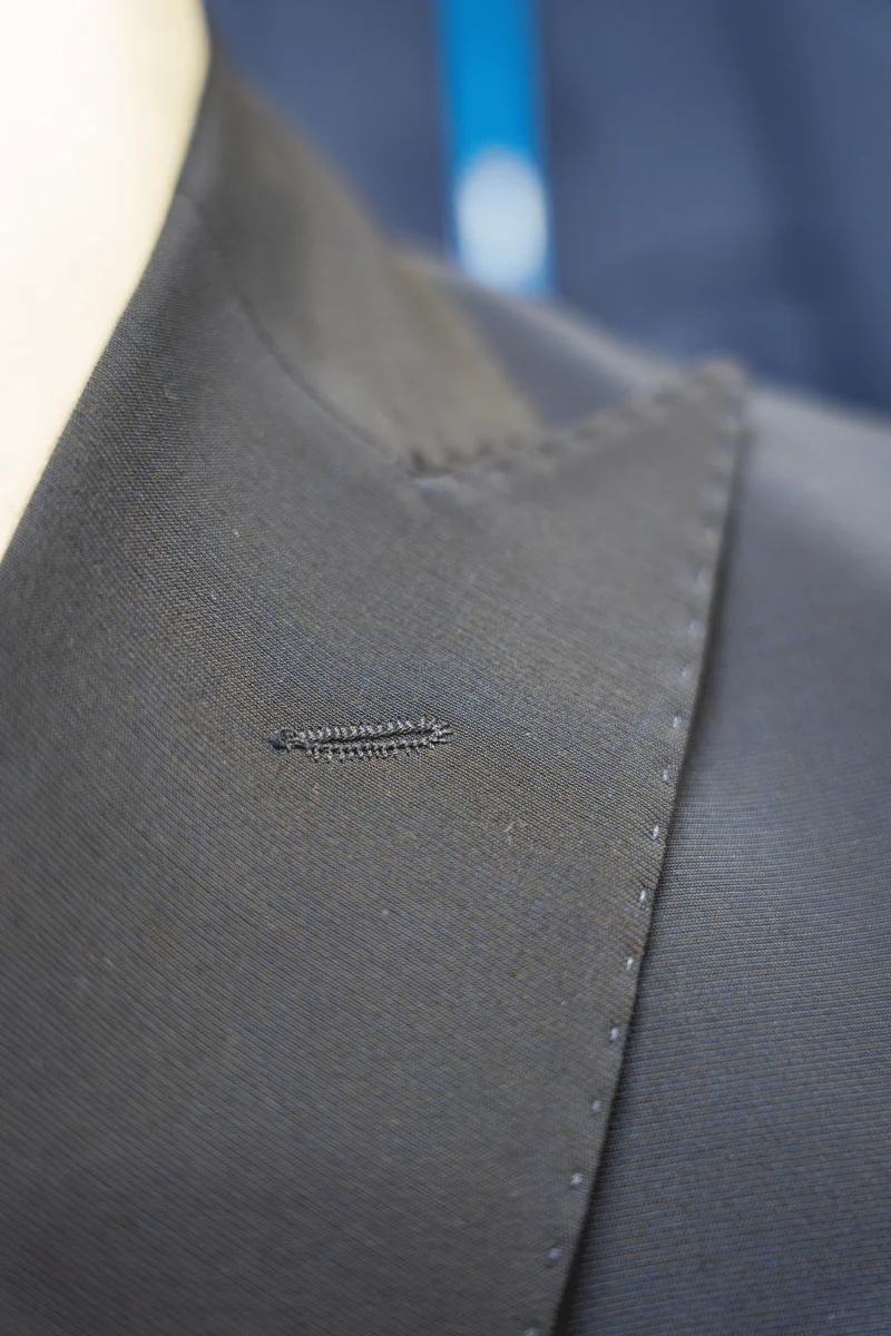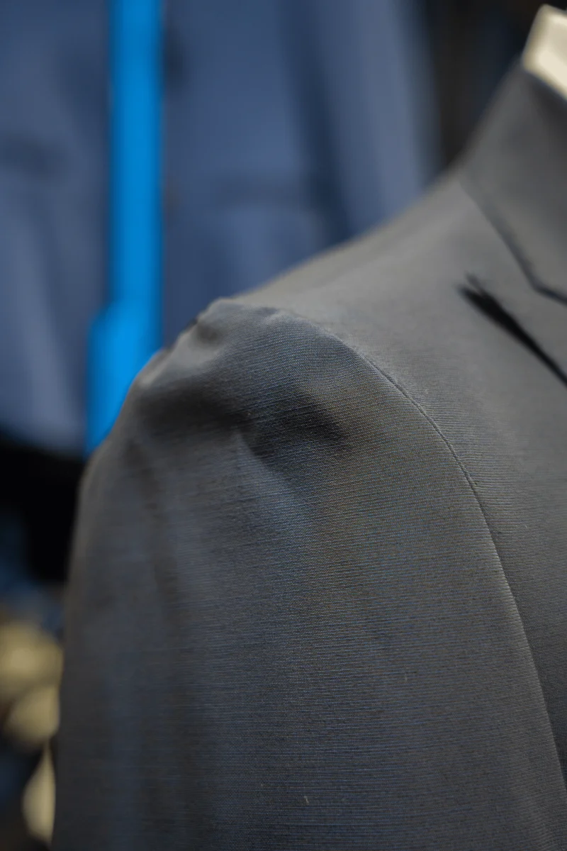 Foderato, spalla napoletana arricciata, quest’abito grazie a questo speciale tessuto ha la capacità di essere una seconda pelle una volta indossato.