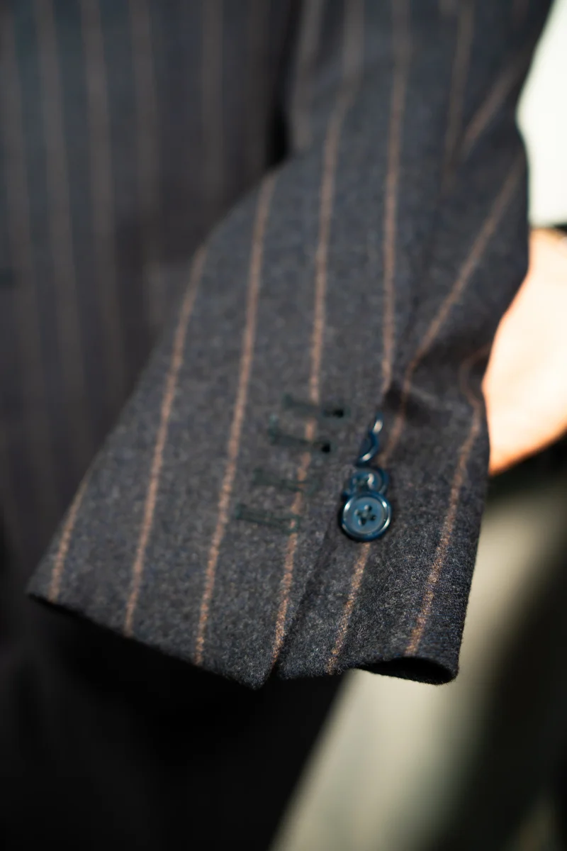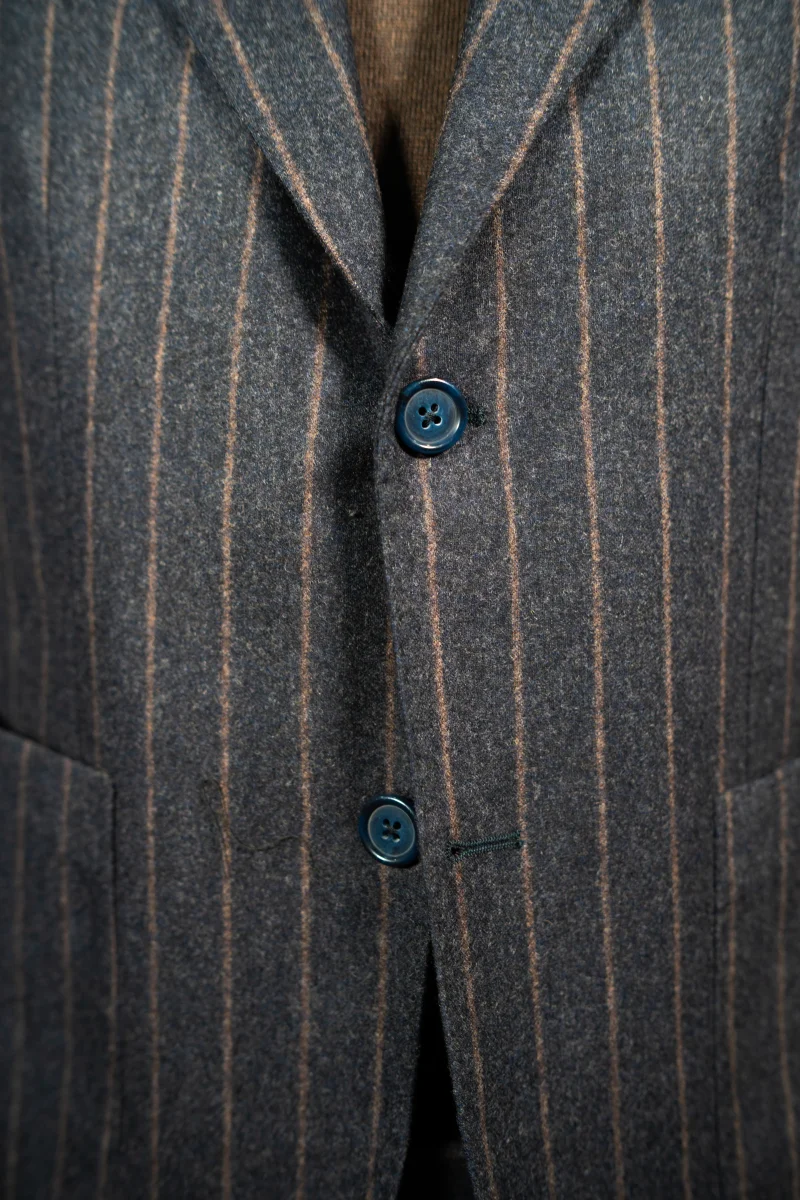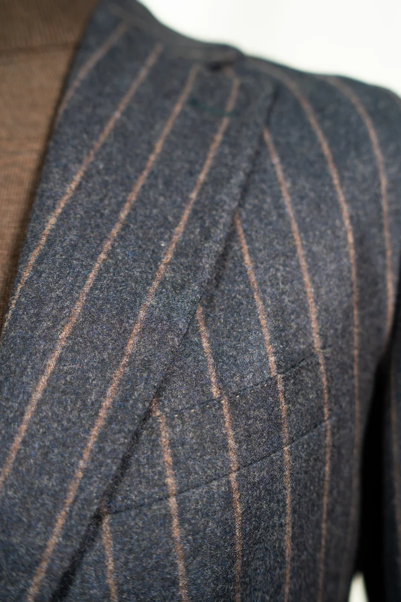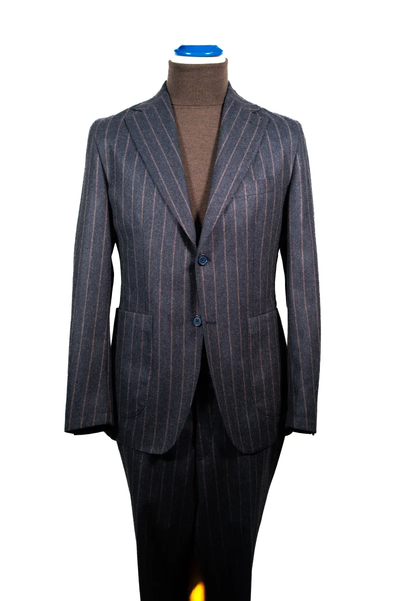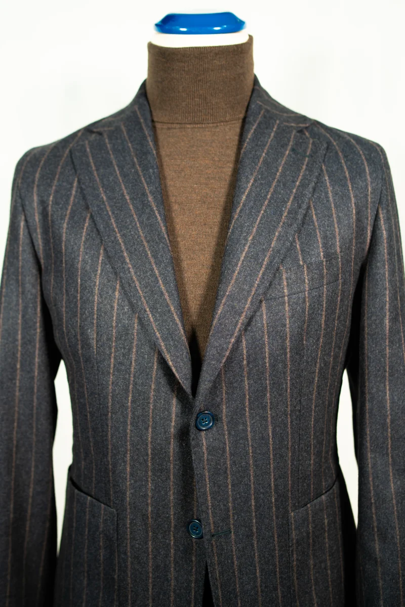 Abito gessato invernale in fondo grigio scuore con rigo marroncino, monopetto due bottoni rever classico 9 cm.