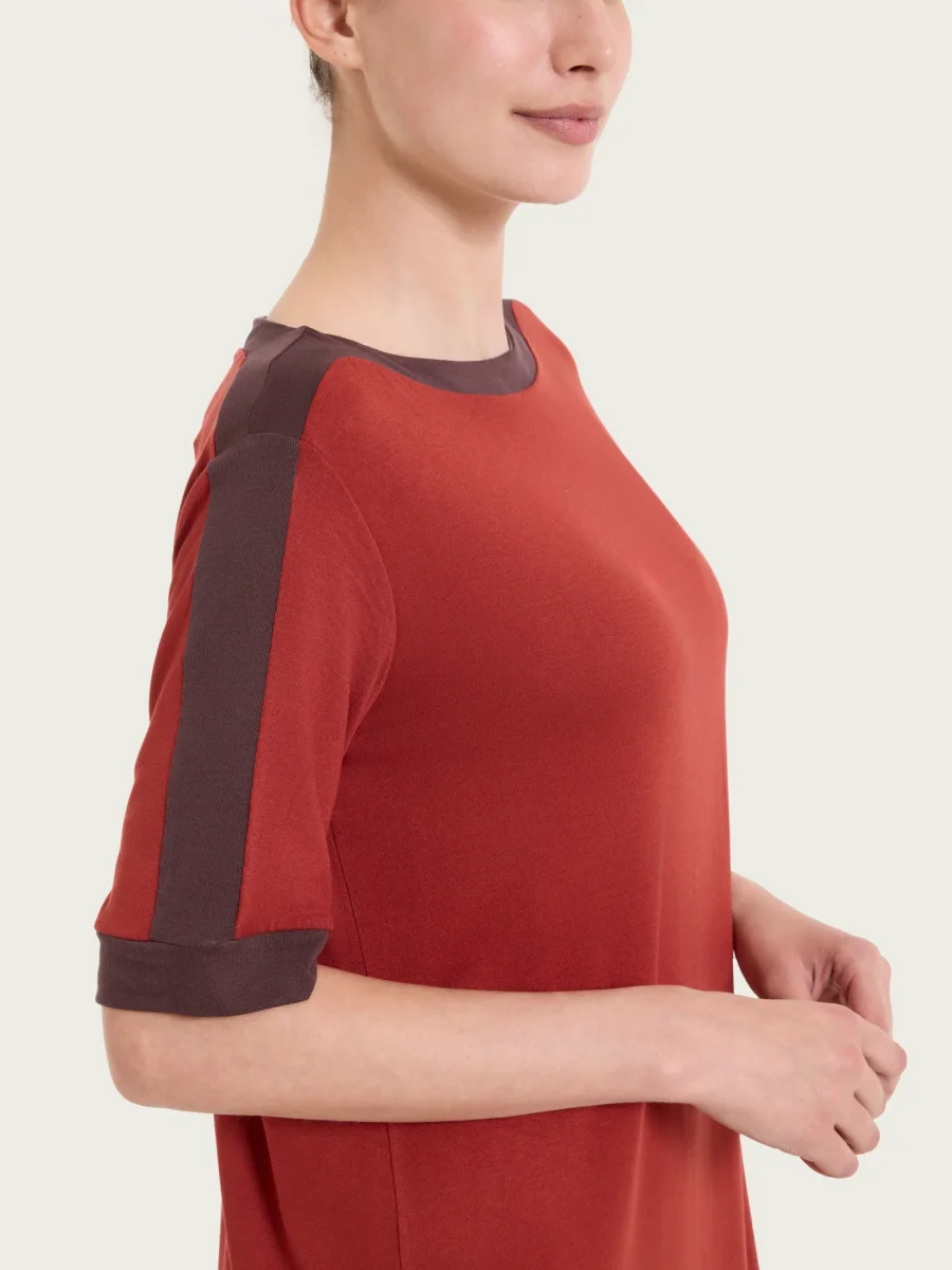 Realizzato con un tessuto fresco e traspirante in jersey elasticizzato di viscosa, una fibra di origine cellulosica che unisce le migliori qualità della seta e del cotone.