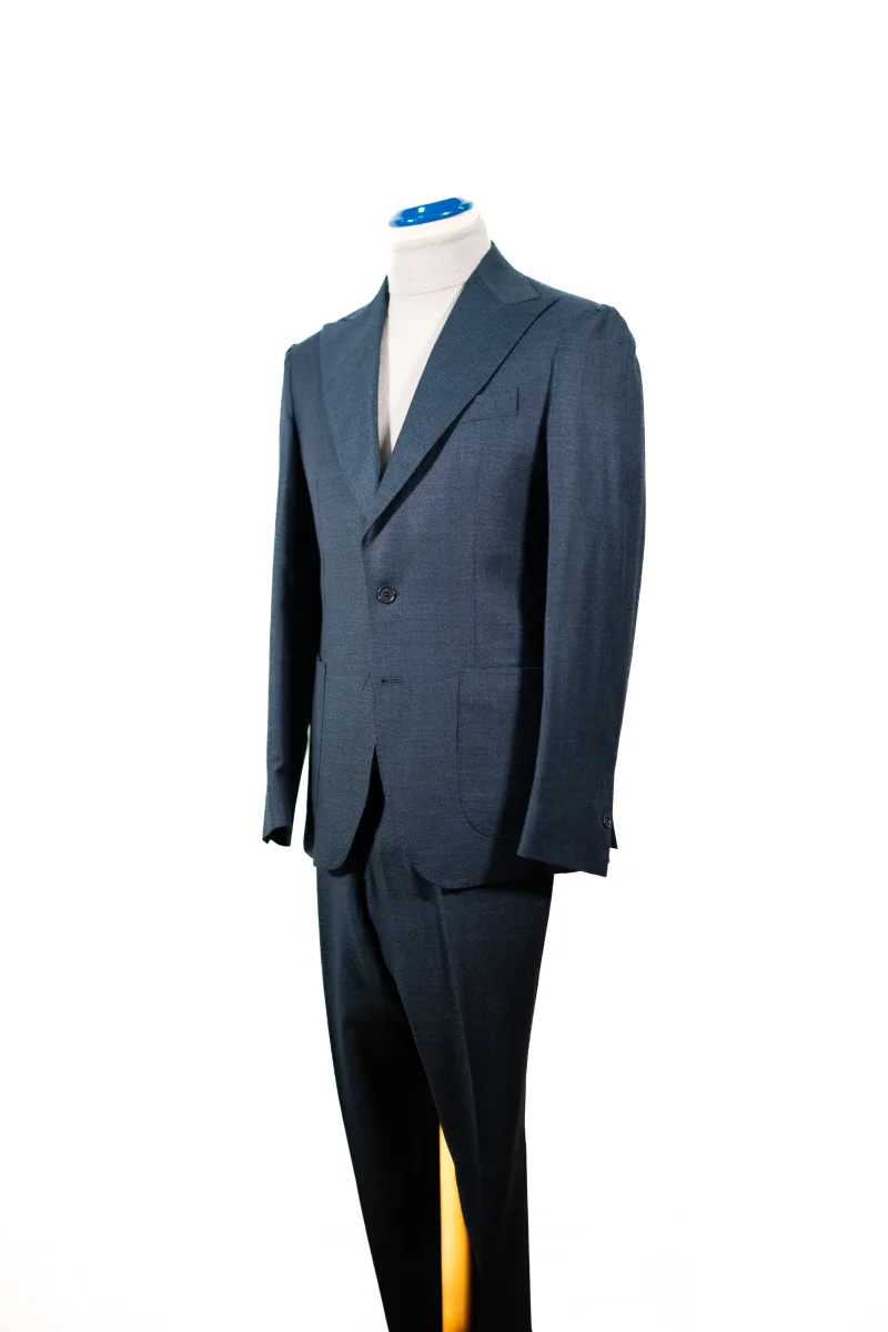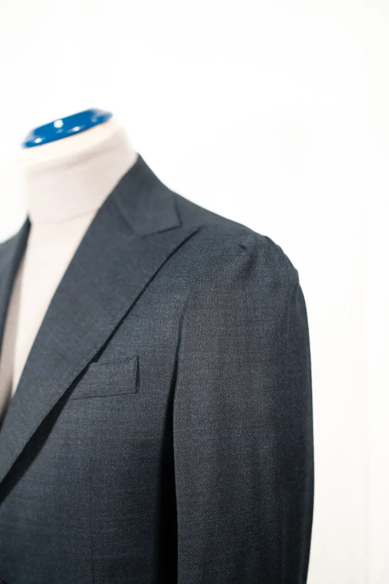 Un’asola alle maniche, spalla napoletana aricciata e destrutturata, tasche a toppa, completamente foderato
