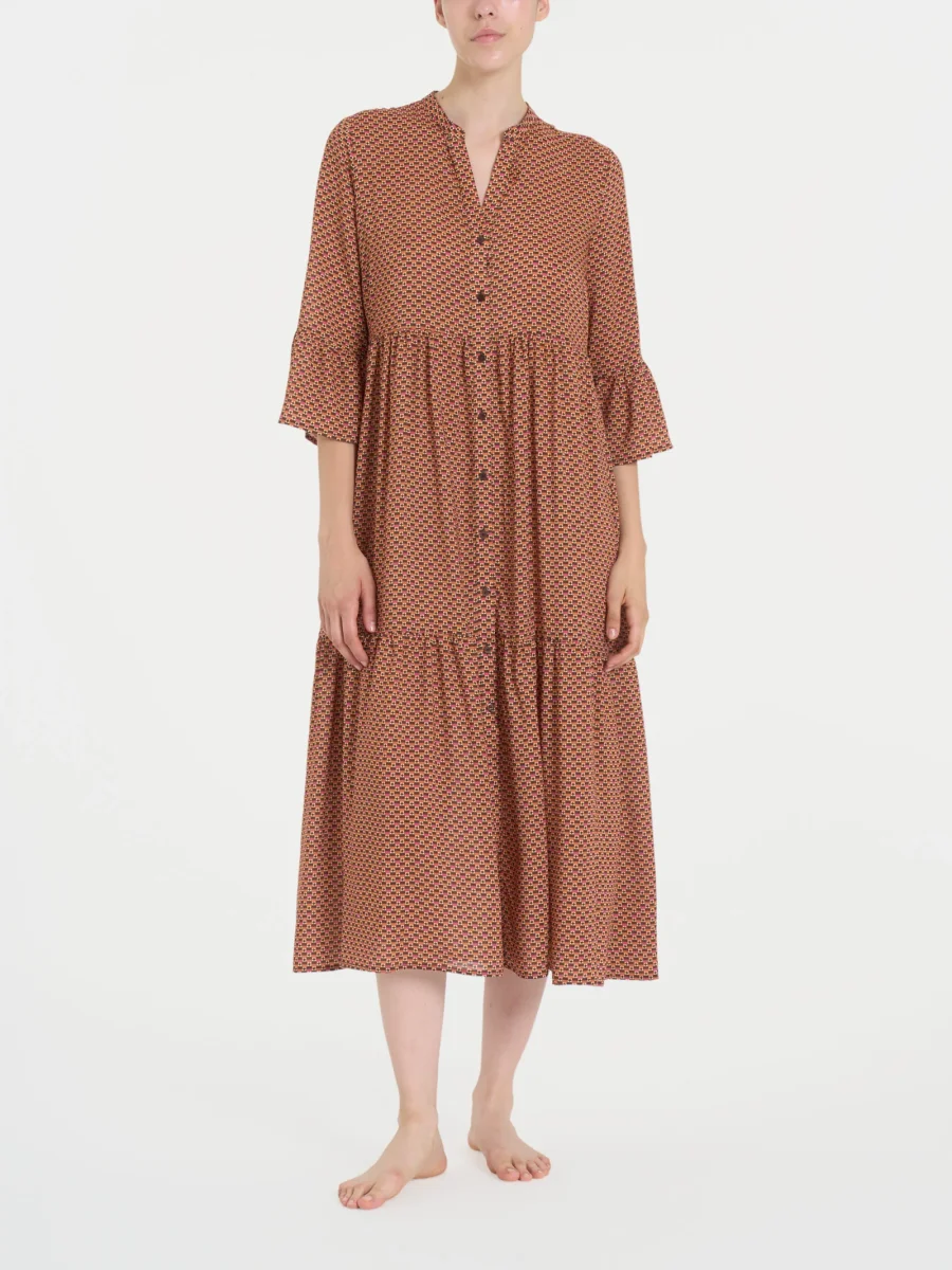 La pratica apertura con bottoni ne facilita l’indosso, mentre la lunghezza dell’abito, che arriva sotto il ginocchio (122 cm per la tg.2), avvolge la figura con eleganza, offrendo praticità e comfort per molteplici occasioni.