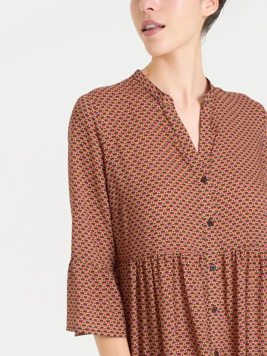 Le maniche 3/4 con una leggera balza sul finale offrono una lunghezza intermedia che dona equilibrio al design e che garantisce copertura, mantenendo al contempo leggerezza e ampiezza per un tocco di freschezza, perfetto per le giornate calde.