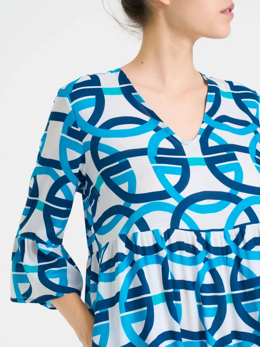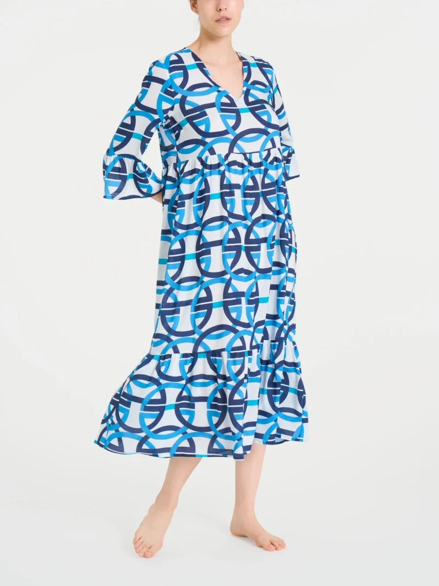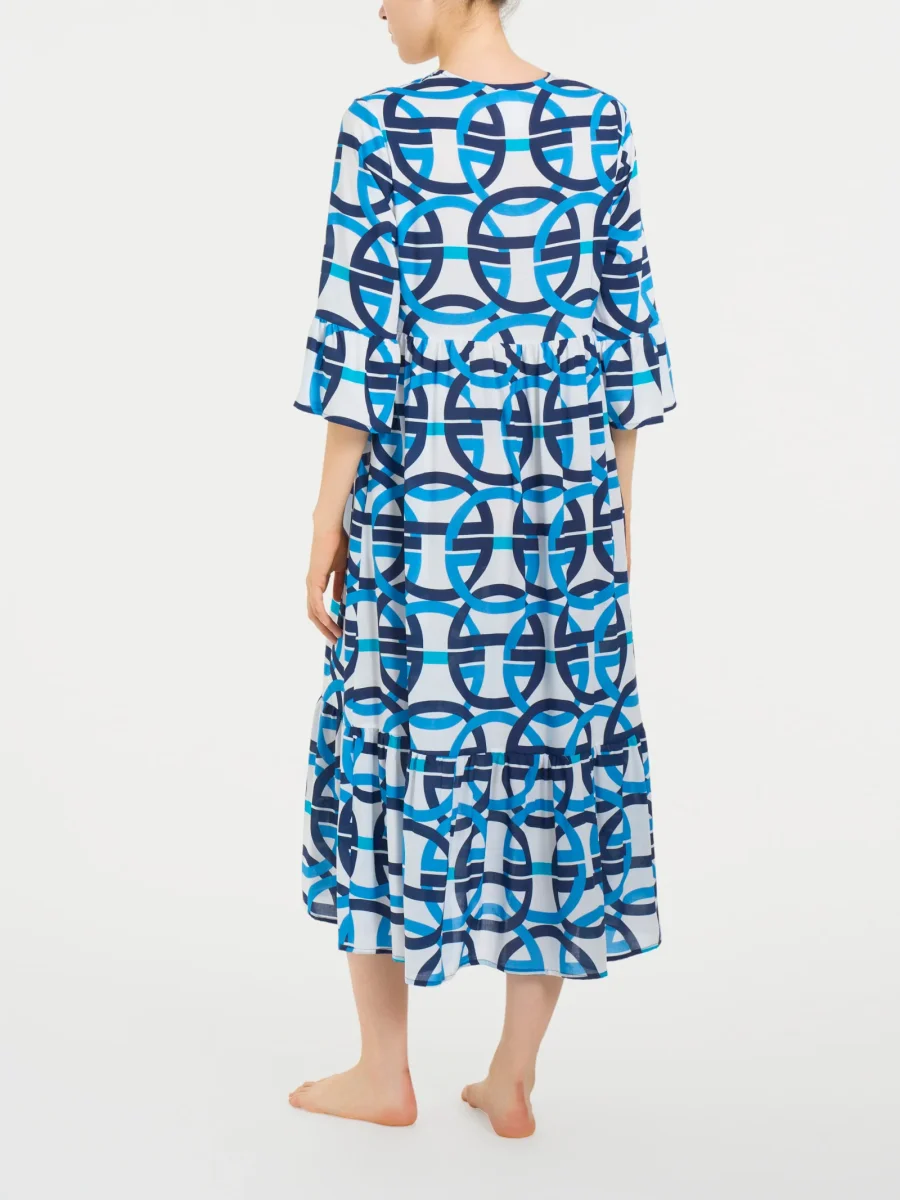 Le maniche 3/4 con una leggera balza sul finale offrono una lunghezza intermedia che dona equilibrio al design, coprente, ma allo stesso tempo leggera e larga così da rendere l’abito fresco e adatto alle giornate più calde.
