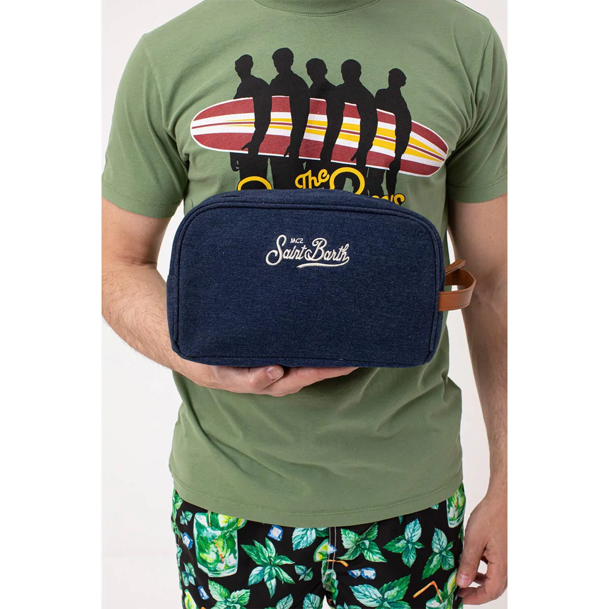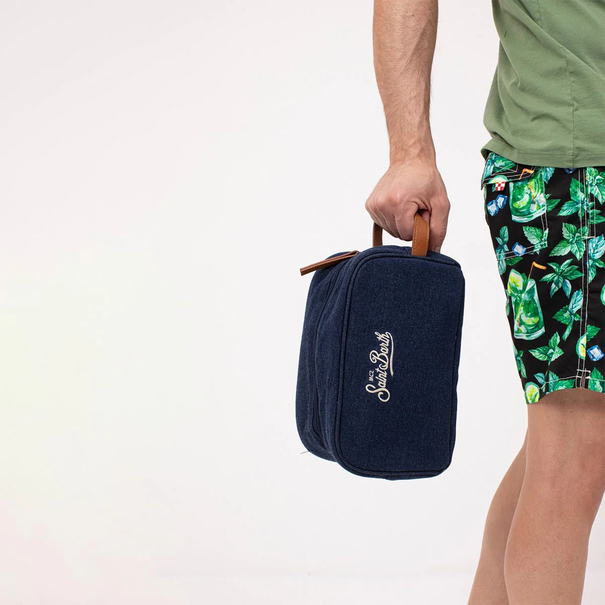 Beauty case realizzato in lino blu. Chiusura principale con zip, manico in ecopelle marrone. Logo Saint Barth ricamato sul davanti in contrasto colore bianco. Interno impermeabile.