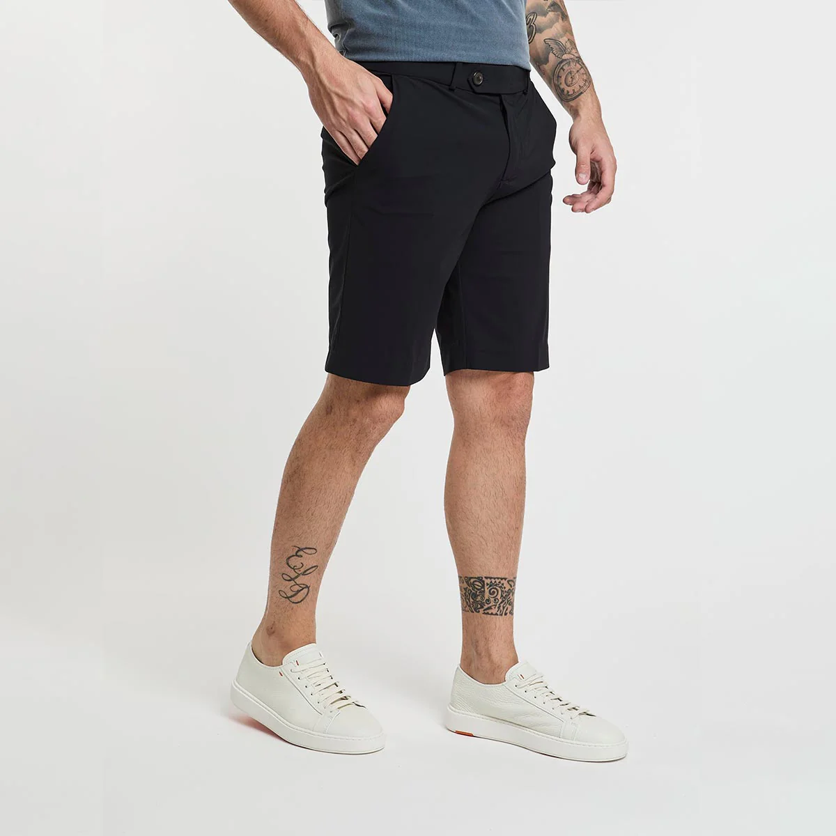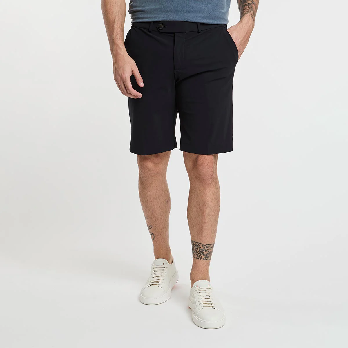 Bermuda chino con vita a passanti regolata dal doppio bottone in corno, la chiusura a zip sul davanti celata dalla pattina, le tasche laterali alla francese e il fondo risvoltato spiccano sull’effetto super opaco del tessuto stretch. La tasca destra è provvista del pratico taschino portamonete, mentre le tasche posteriori a filetto sono impreziosite dal logo a microiniezione nero. Il tessuto SURFLEX® leggerissimo ed elasticizzato, fresco ed easy care, garantisce il comfort anche nelle giornate più calde dell’estate. Il modello presenta diverse tasche e il logo a microiniezione nero.
