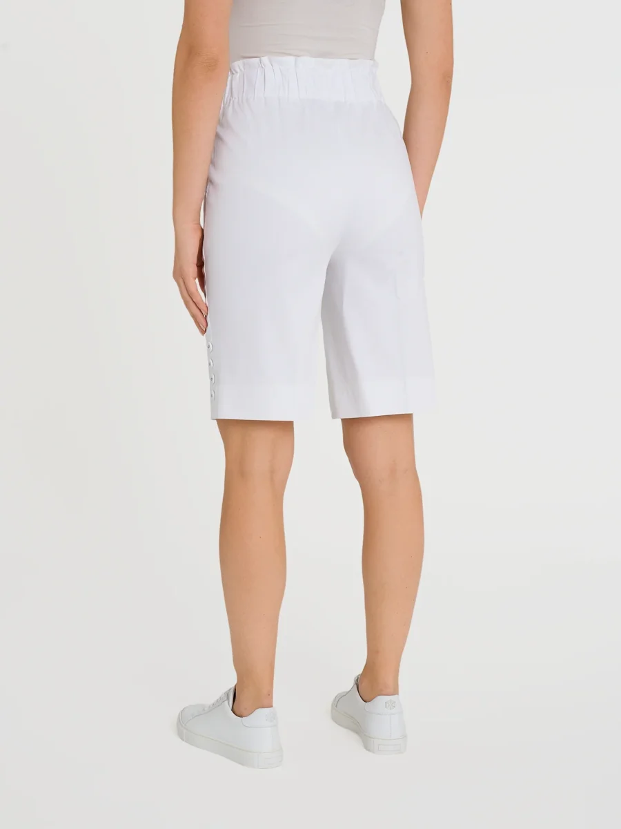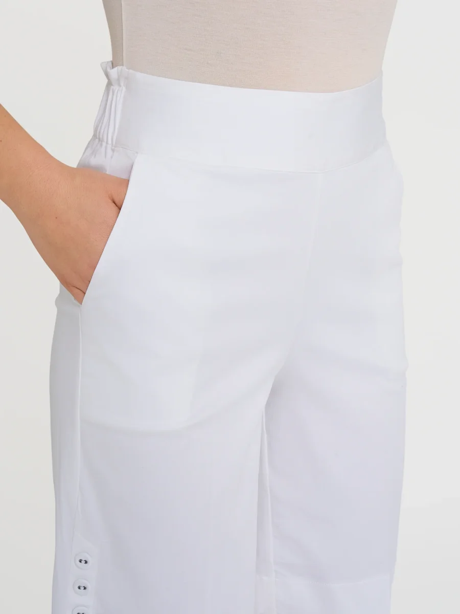 Questo modello senza zip è costruito con vita elasticizzata, tasche laterali e quattro eleganti bottoni applicati sul fondo i quali donano un tocco di stile.