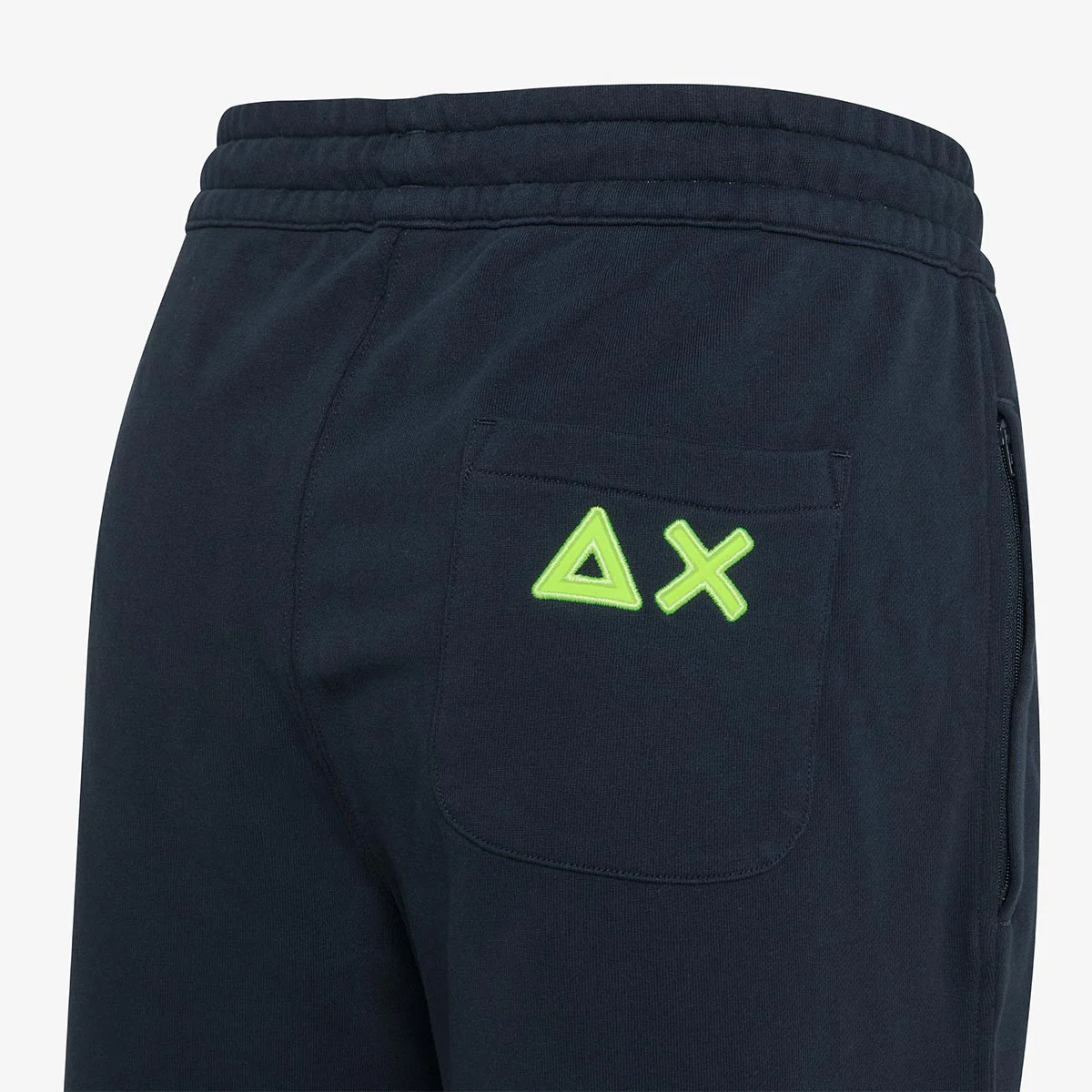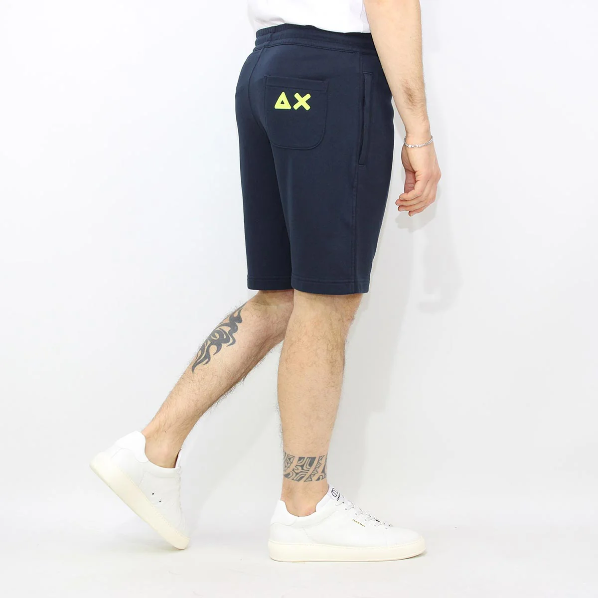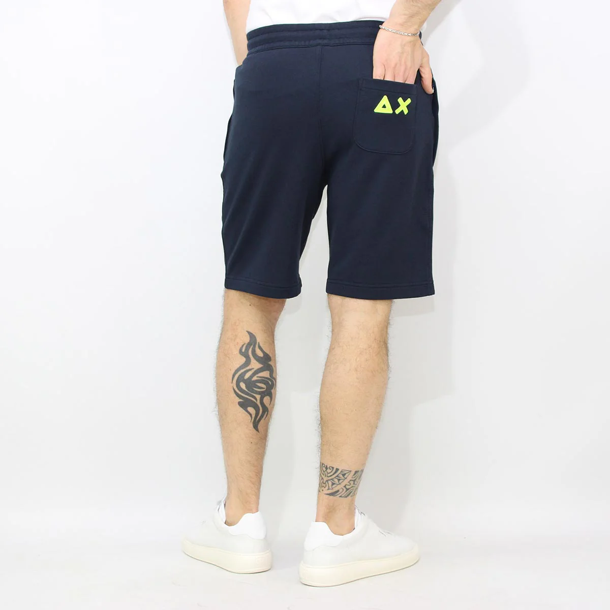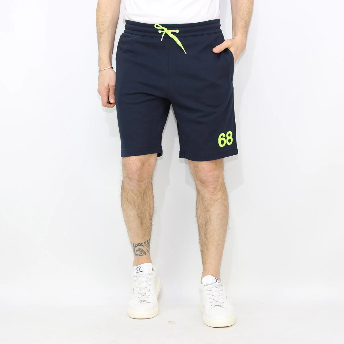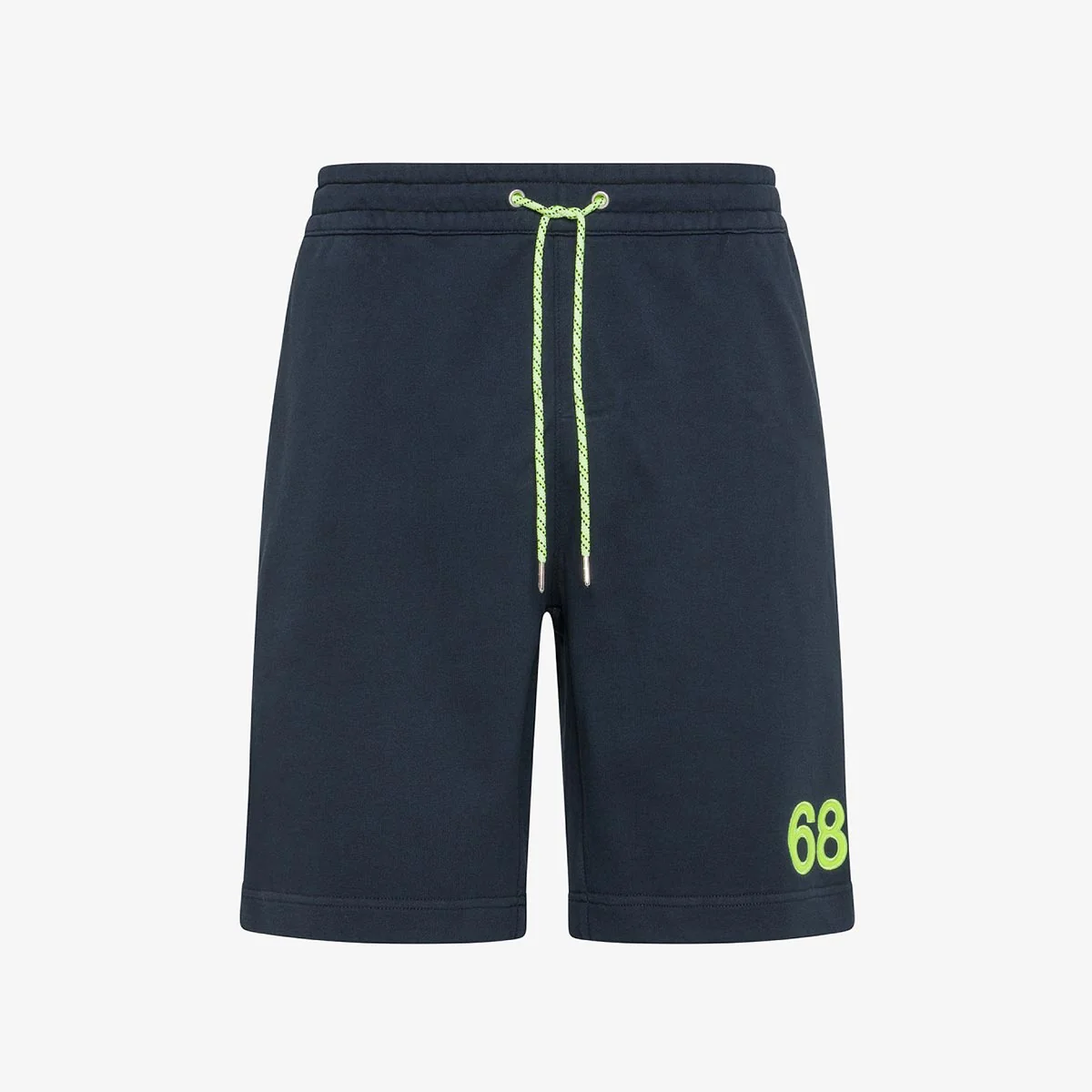Bermuda in felpa non garzato. Colore blu navy. Elastico in vita con coulisse fluo. Tasche a filo con zip. Tasca posteriore applicata con logo ricamato giallo fluo. Logo “68” giallo fluo sulla gamba sinistra.