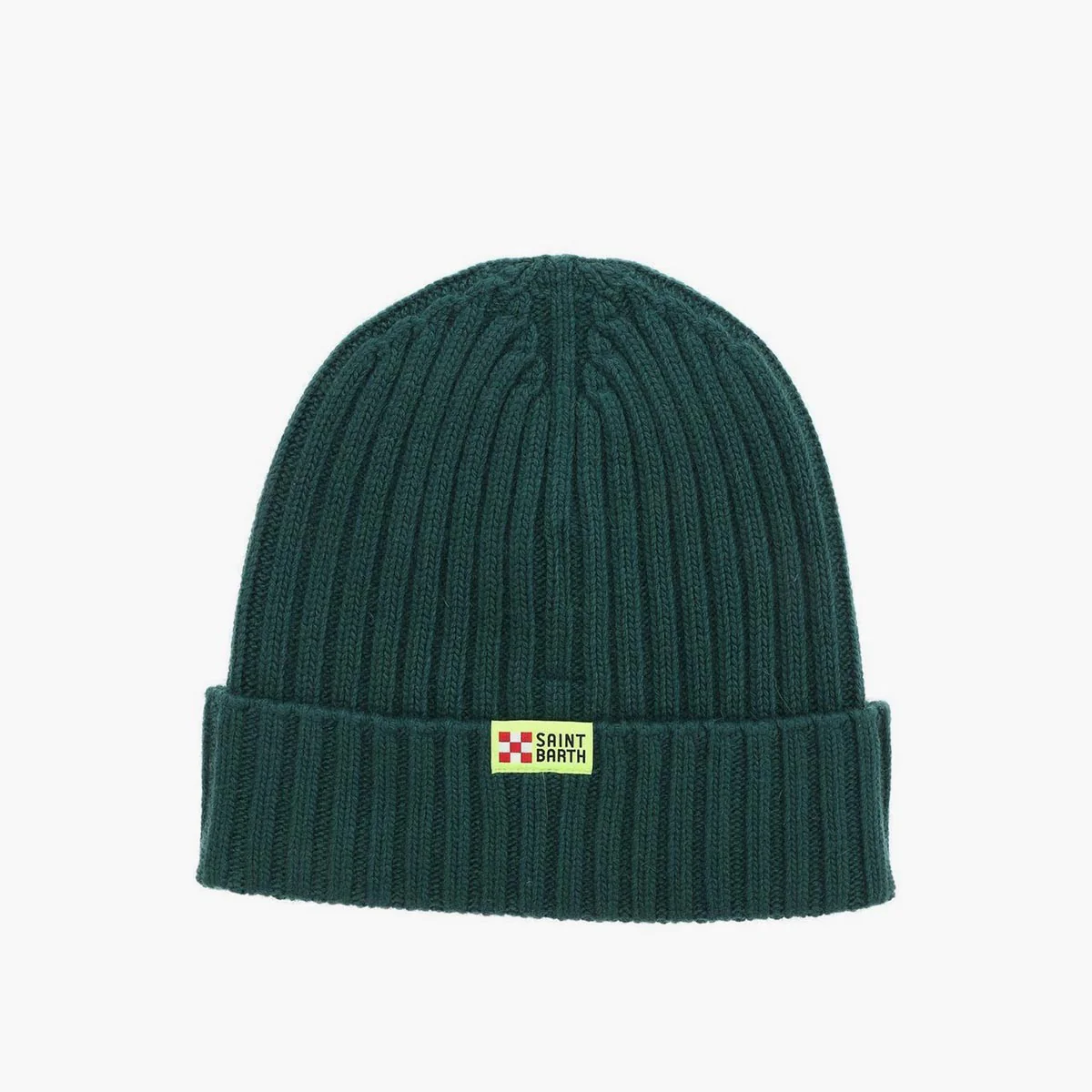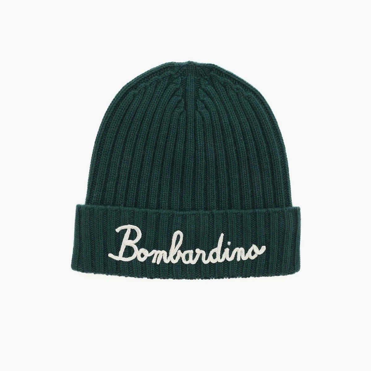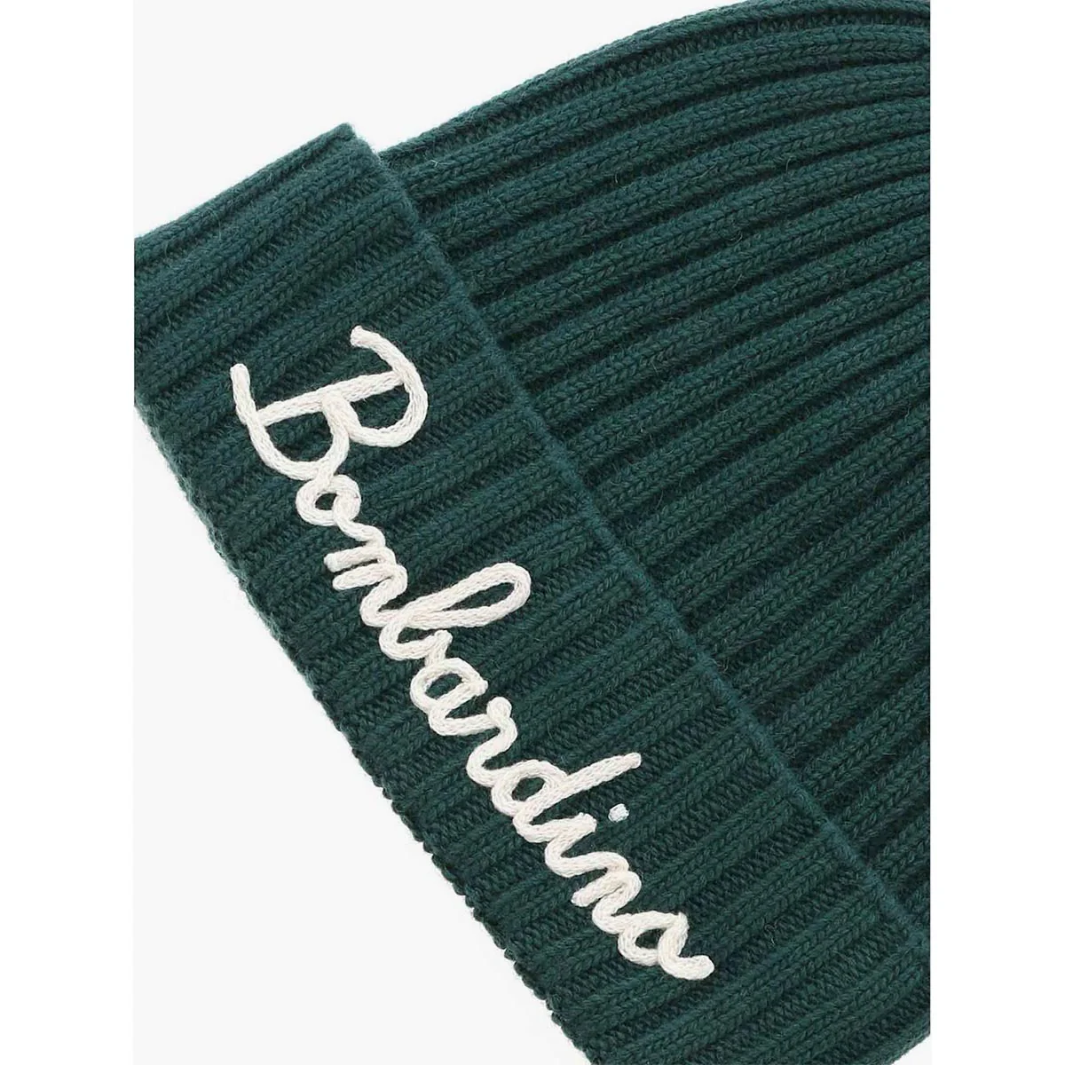 Cappello a costine in misto cashmere, rifinito sul polsino con un nome ricamato “bombardino”, verde con ricamo bianco.