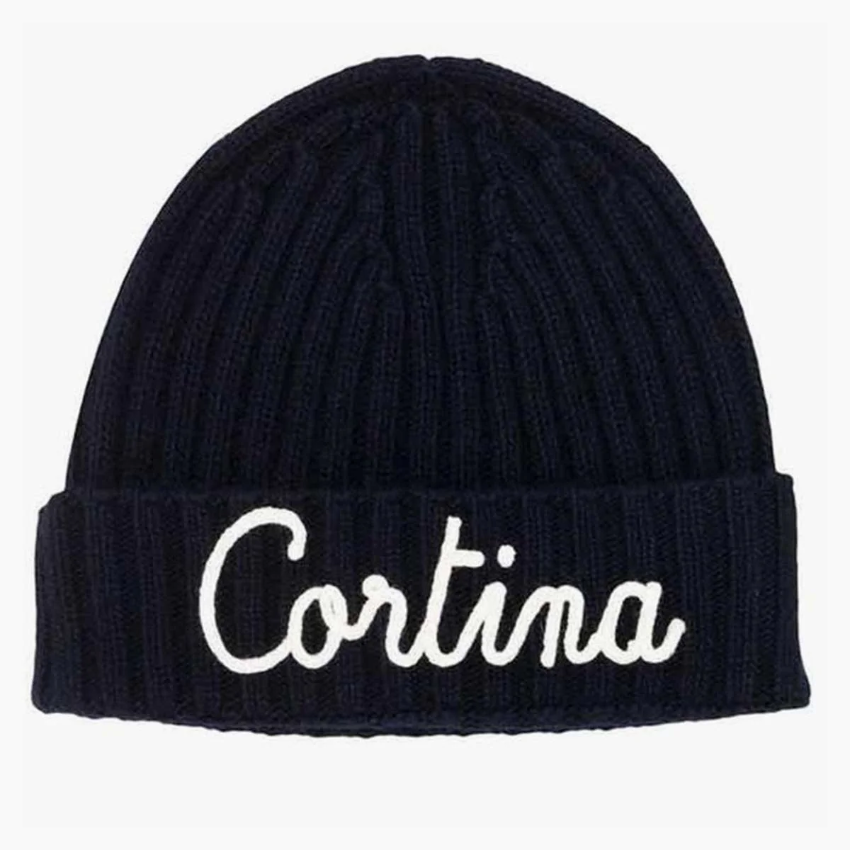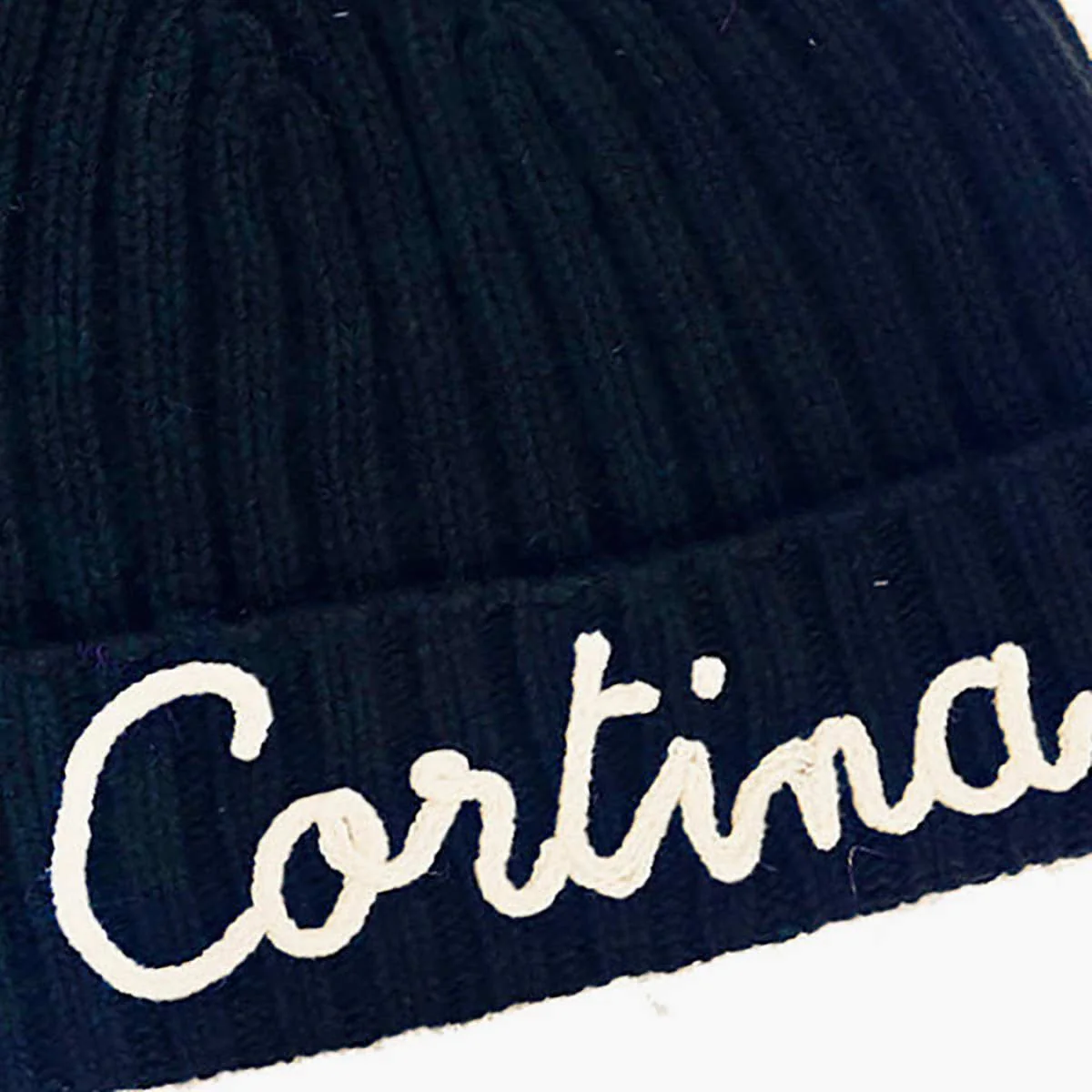 Cappello a costine in misto cashmere, rifinito sul polsino con un nome ricamato “Cortina”,blu con ricamo bianco.