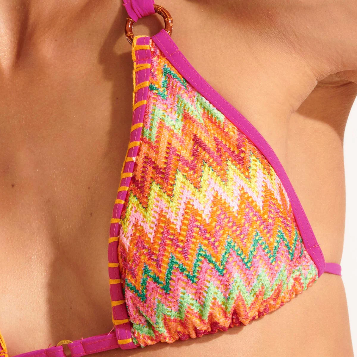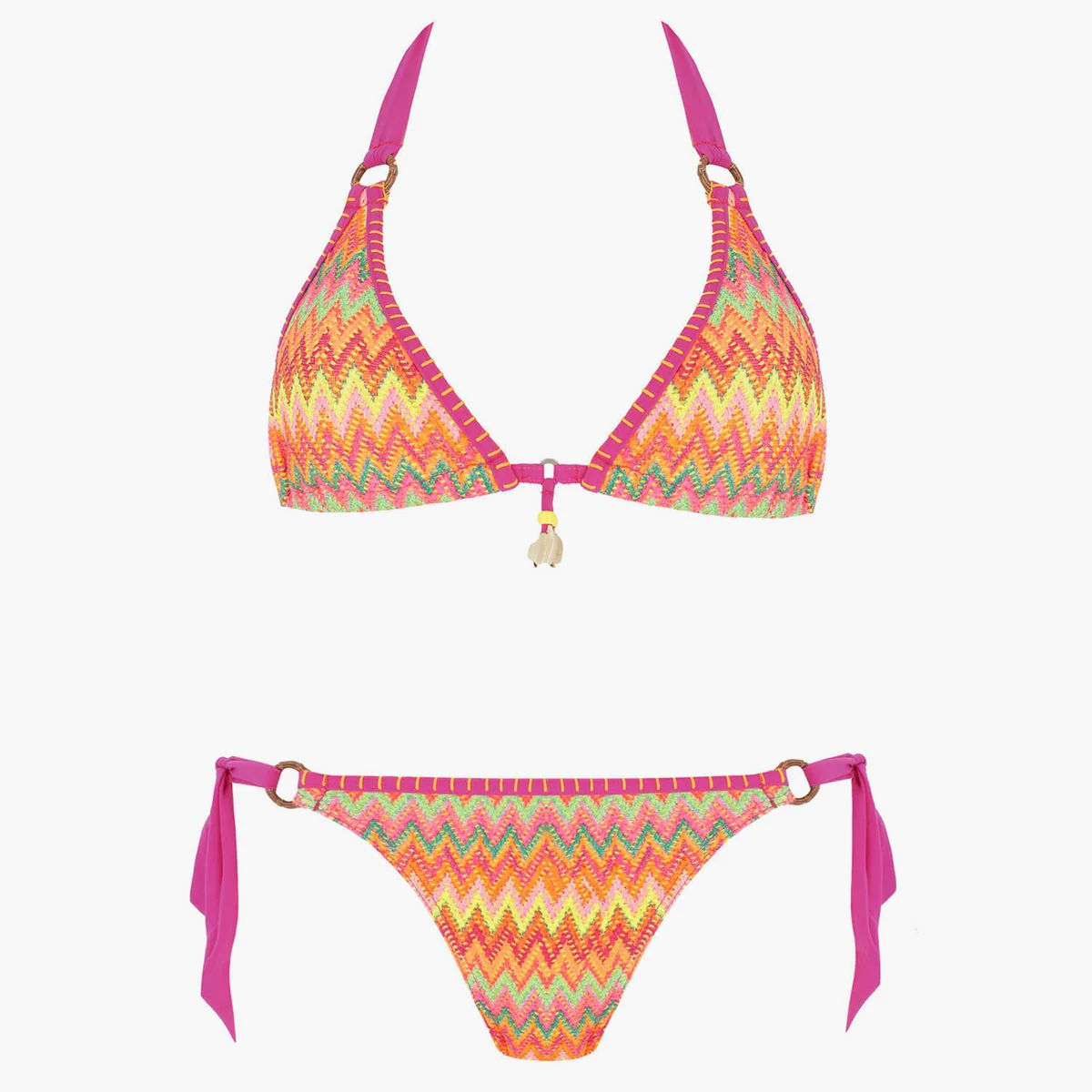 Bikini due pezzi rete su tessuto foderato, reggiseno mare a triangolo con coppe estraibili. Slip da annodare con laccetti regolabili modello sgambato.