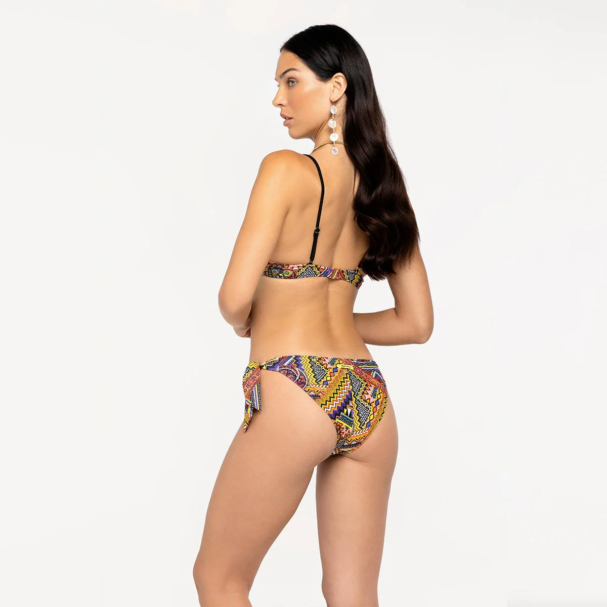 Bikini top con stampa e slip con nodi regolabili. Chiusura posteriore con ferretto . Capo dotato di imbottitura interna estraibile.