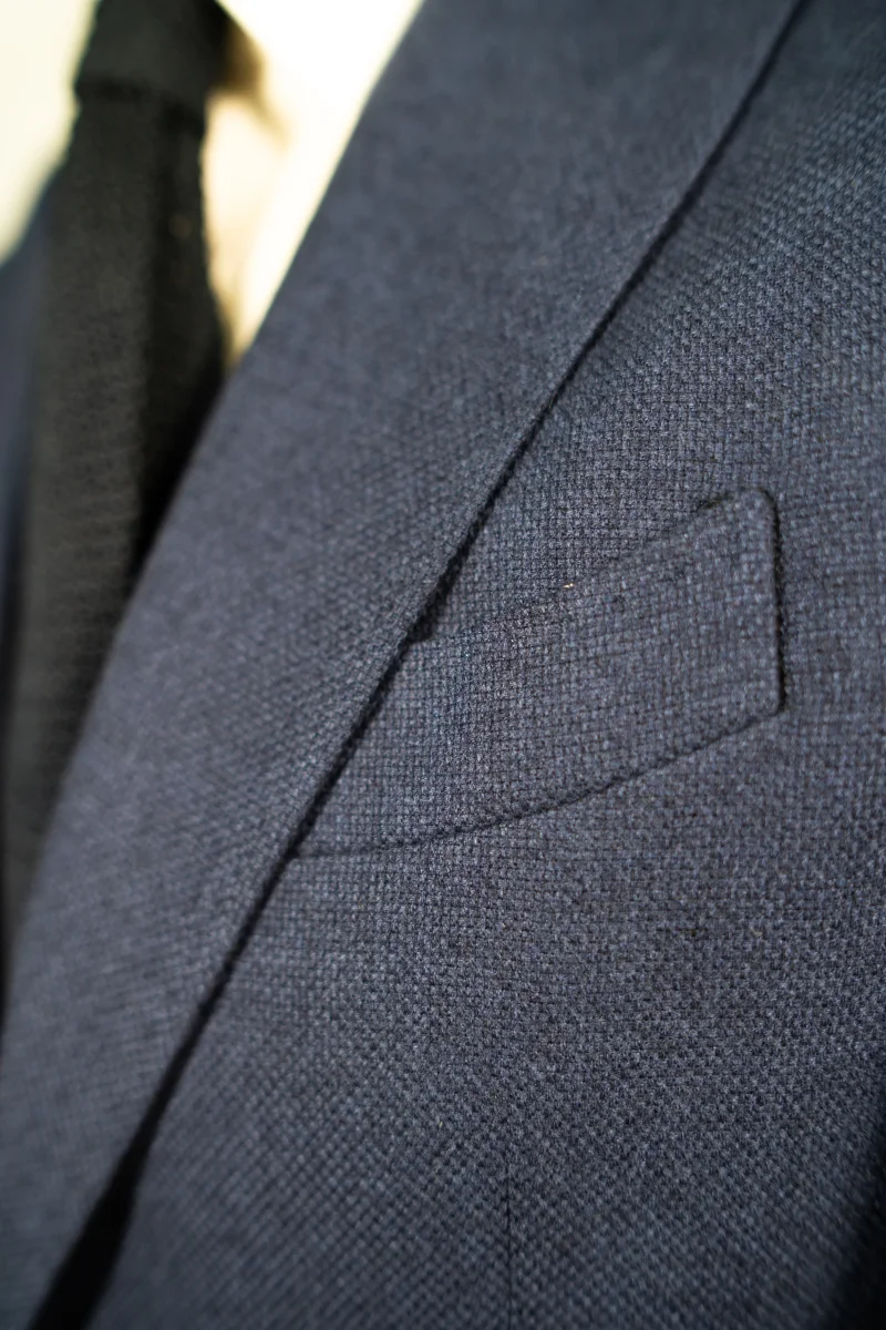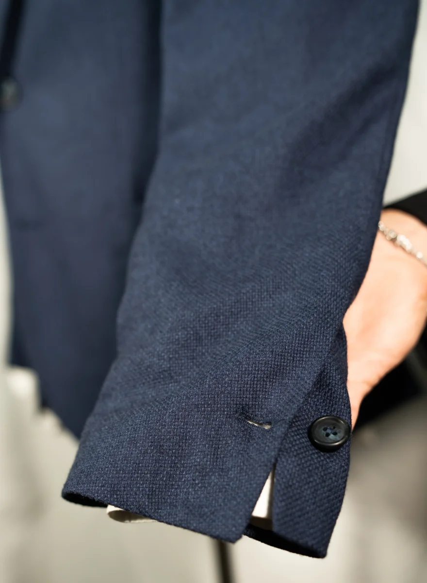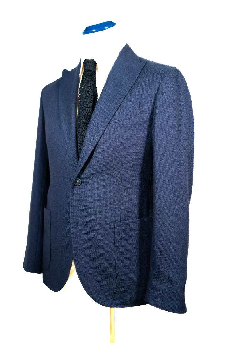 Tasche a toppa, un’asola alle maniche, giacca completamente sfoderata, spalla napoletana arricciata destrutturata.
