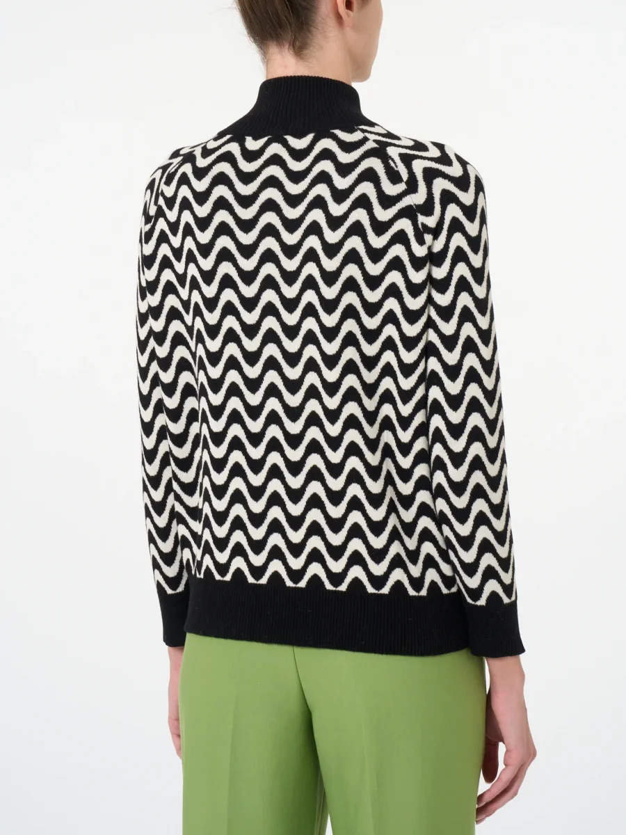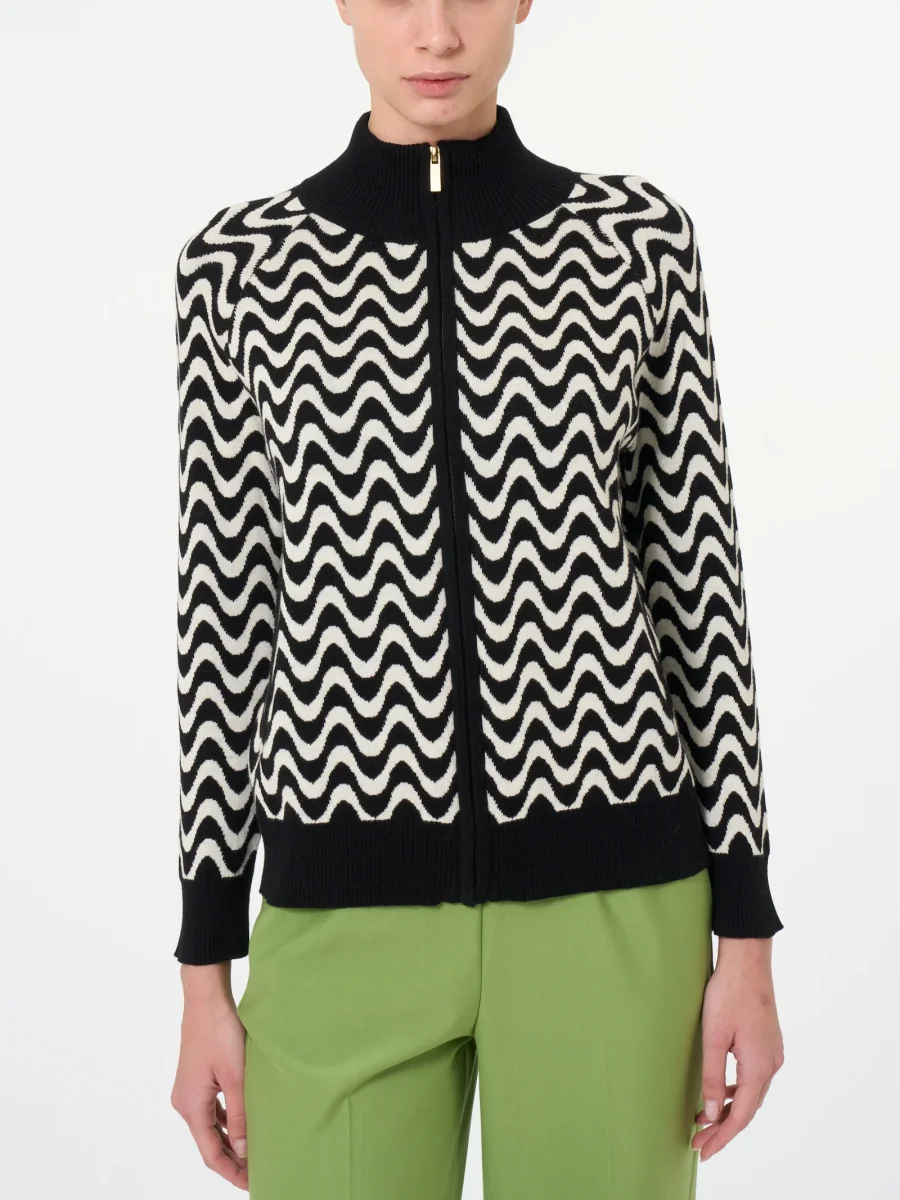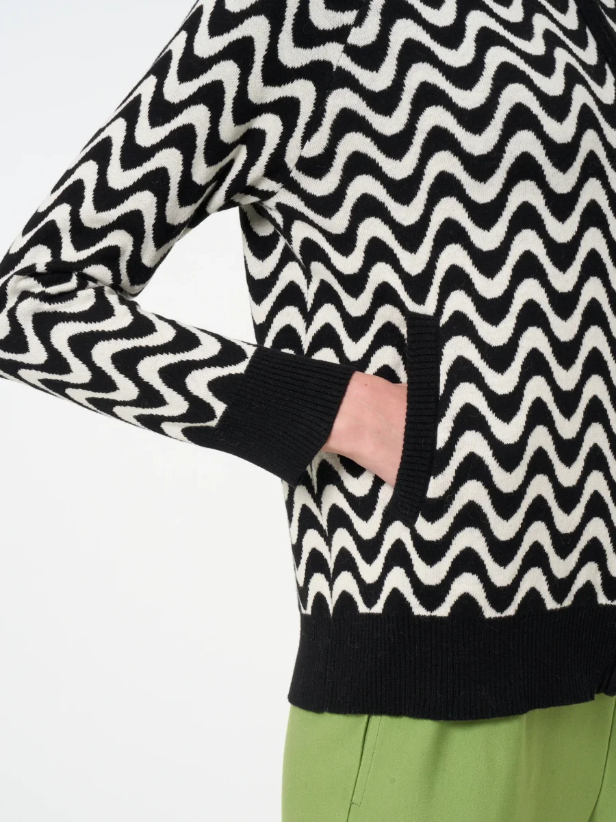 Caratterizzato da una fantasia ad onde che creano un effetto visivo dinamico e accattivante a contrasto con i bordi ed i polsini a tinta unita.