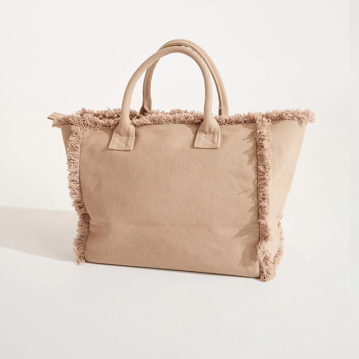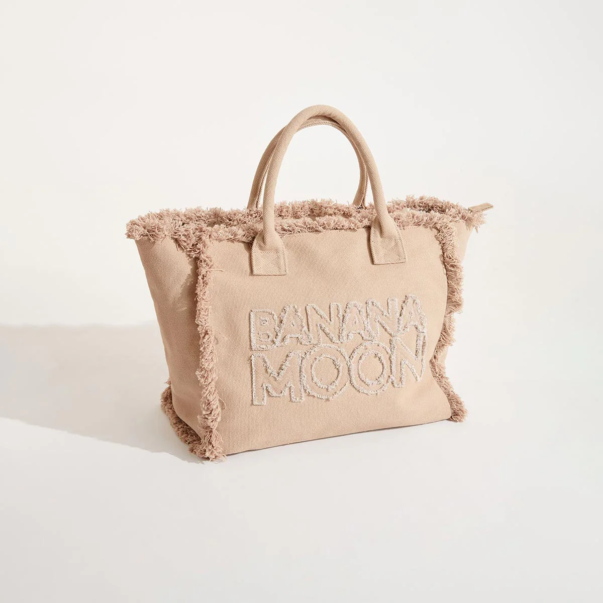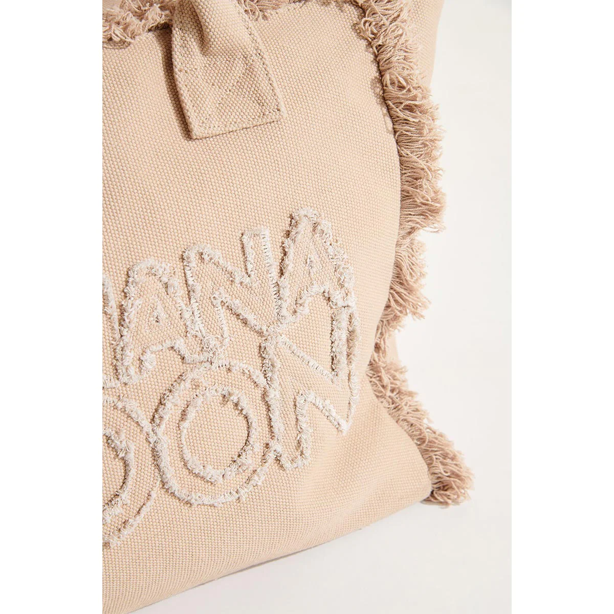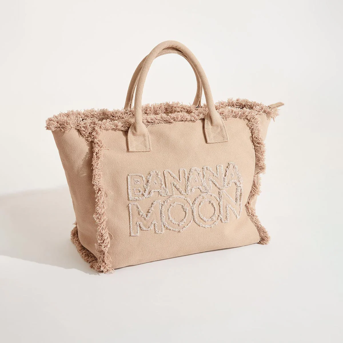 Borsa shopping bag in cotone, scritta Banana Moon ricamata sul davanti. Finiture con frange. Chiusura con zip.