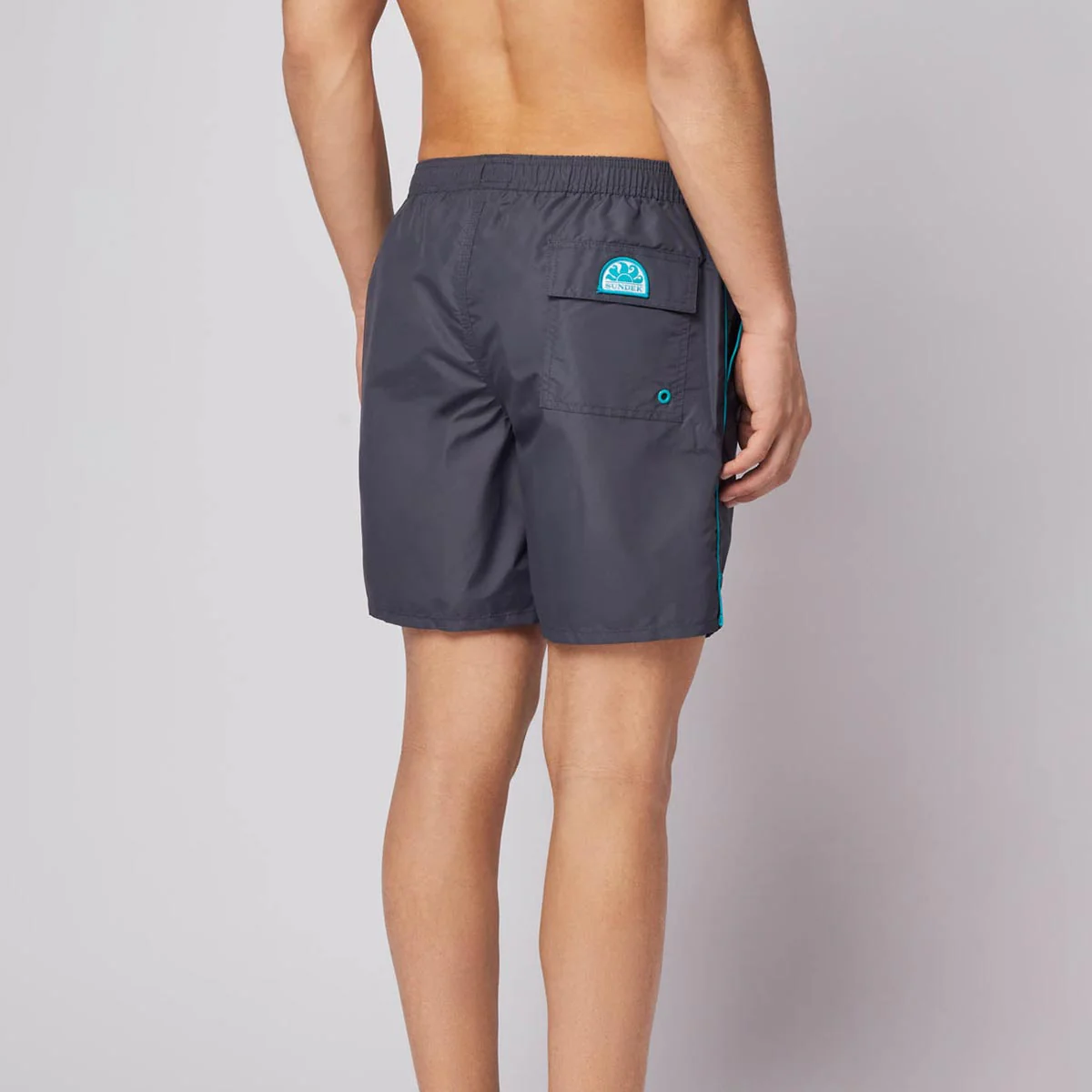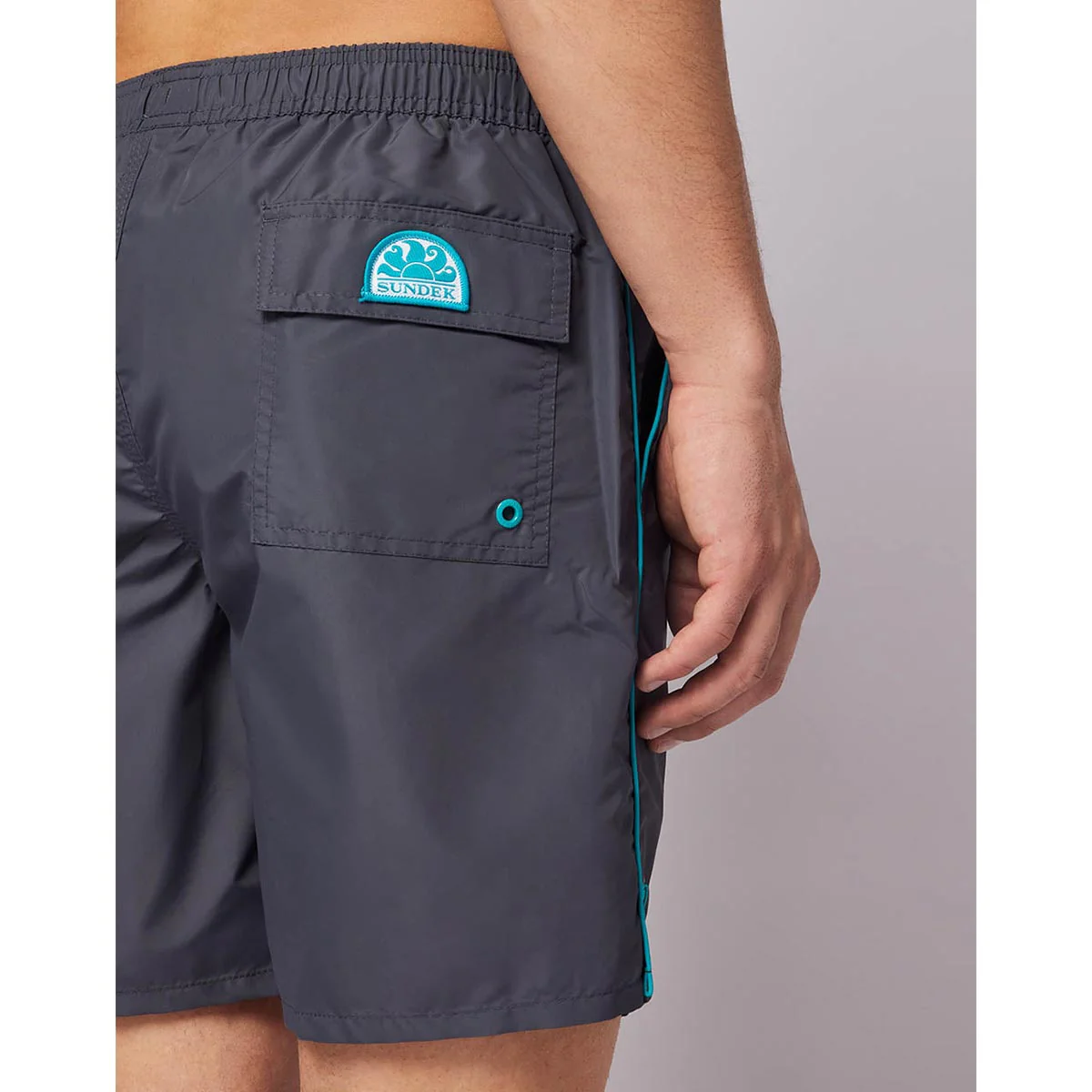 Tasca posteriore a toppa con patta chiusa da velcro e laccio portachiavi all’interno