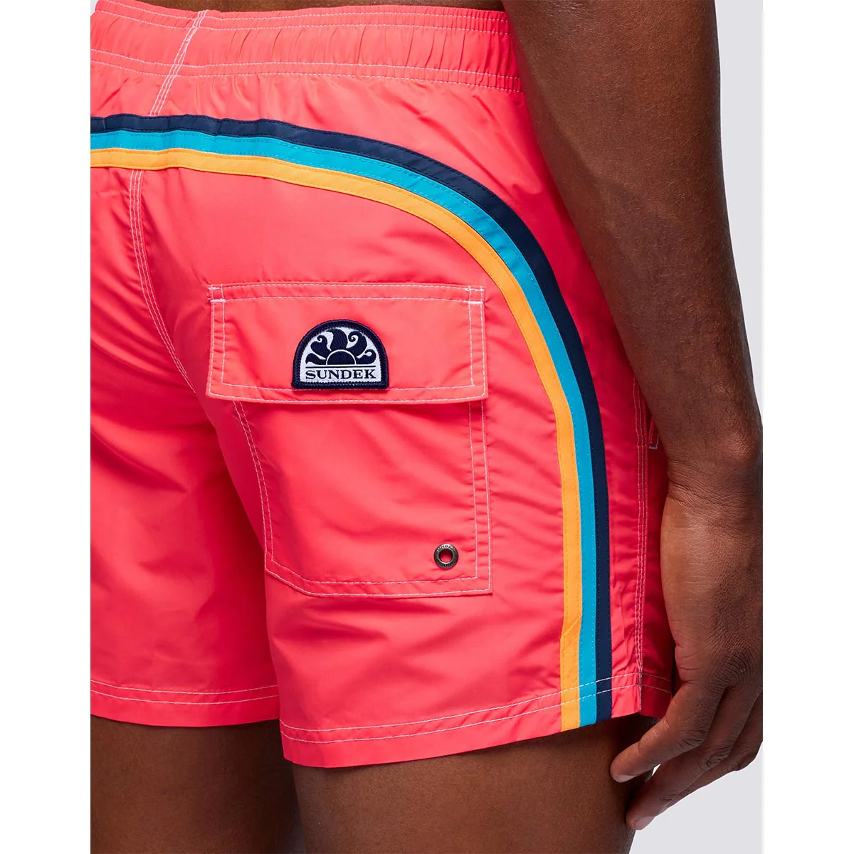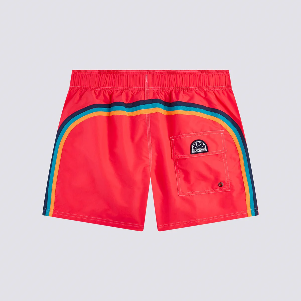 Shorts uomo mare corto e con vita elasticata, coulisse e iconico arcobaleno Sundek sul retro. Boxer con slip interno in rete