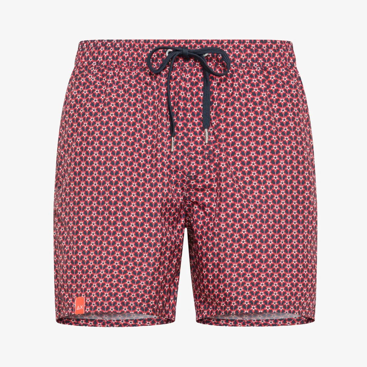 Boxer mare a fantasia a fiori rossi, blu e bianchi. E’ caratterizzato da coulisse in vita e lacci con il logo. Due tasche verticali sui lati e una tasca con strappo sul retro.Slip retina interno