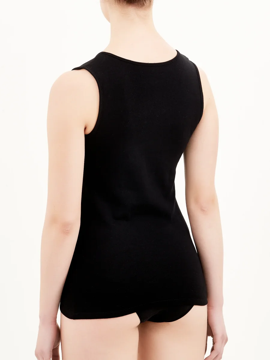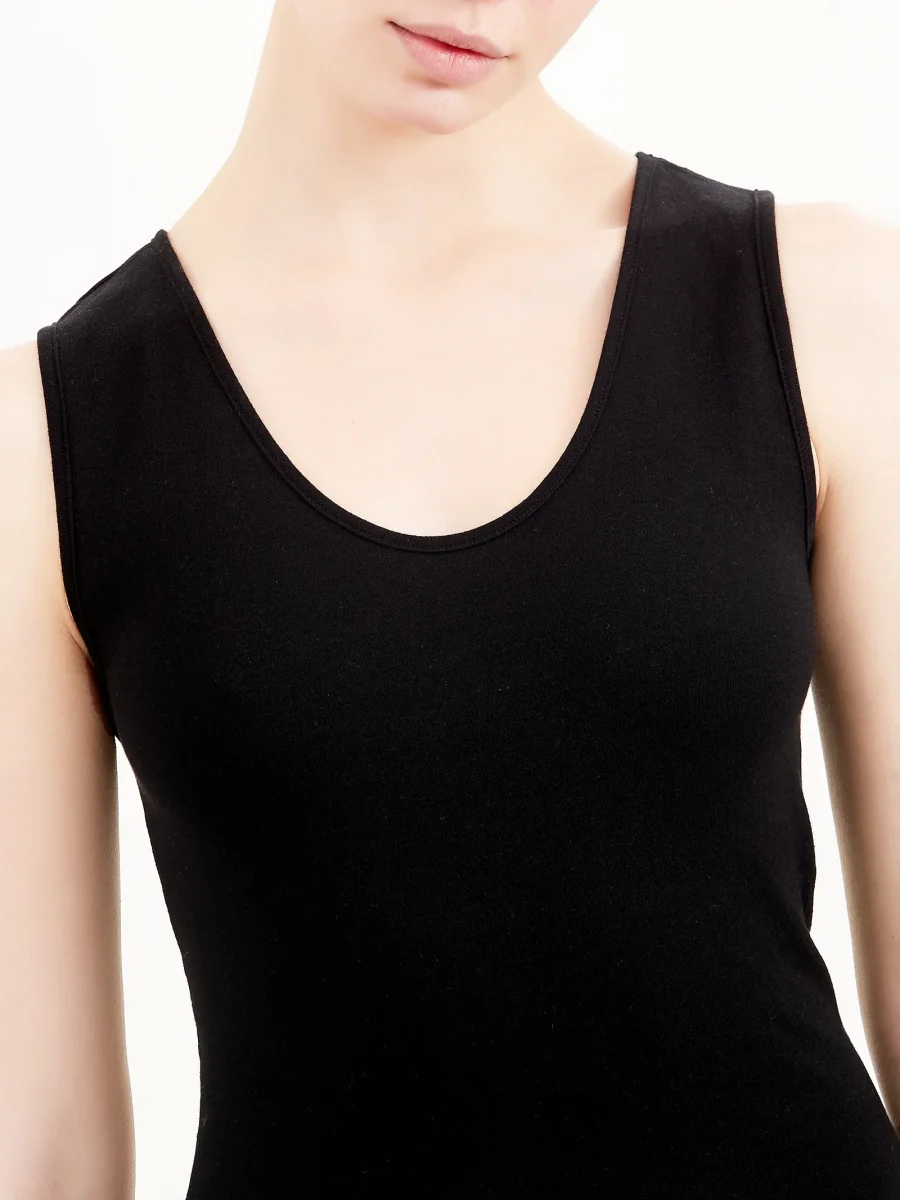 Canottiera a spalla larga in interlock di puro cotone garzato internamente.