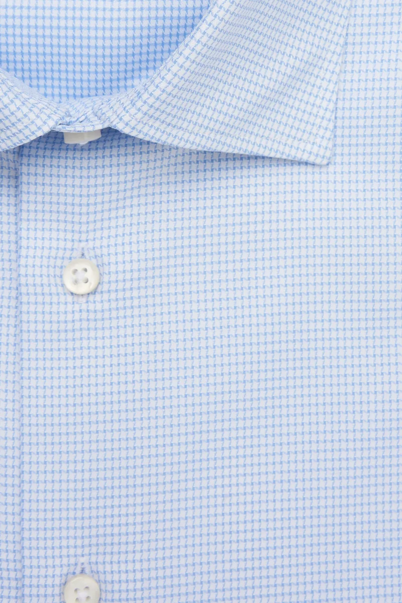 Descrizione: camicia realizzata artigianalmente in Italia, puro cotone pregiato con delicata fantasia .Declinazione raffinata di un classico dell’eleganza maschile, esaltata dal pregio dei bottoni in madreperla, è caratterizzata da vestibilità slim fit.Per il businessman attento ai dettagli che ama infondere un tocco di unicità ai suoi look formali.