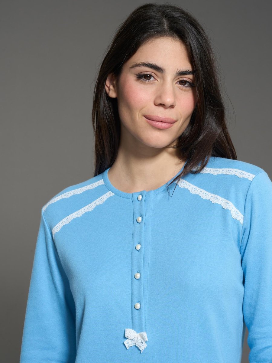 Le maniche lunghe con chiusura sul polso a goccia offrono una copertura completa, adatta per le notti più fresche. La particolarità di questa camicia da notte risiede nei dettagli in pizzo sulle spalle, che aggiungono un tocco di femminilità e raffinatezza al capo.