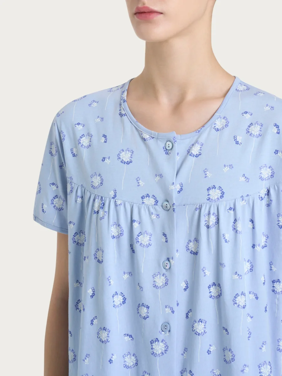 Questa camicia da notte, impreziosita da una fantasia all-over di soffioni, conferisce un aspetto delicato e leggero, evocando la sensazione di petali che si disperdono al vento e aggiungendo un tocco poetico al design.