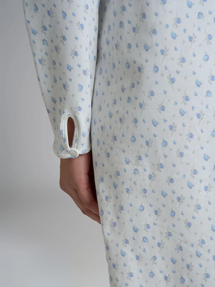 La manica lunga definita da un piccolo bottone sui polsi aggiunge un importante tocco di stile, mentre la fantasia floreale si estende con equilibrio sul tessuto, richiamando con linee morbide il fascino discreto della natura.