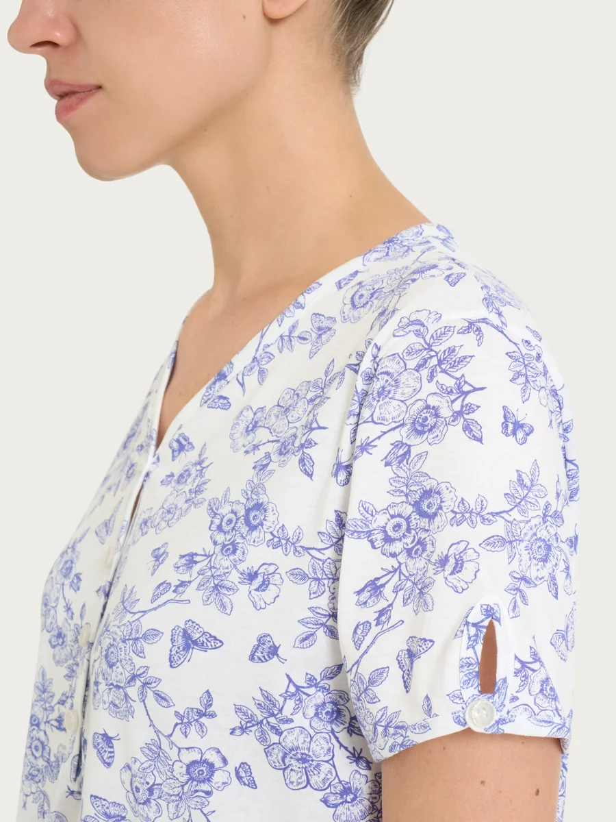 Il modello è caratterizzato da un collo a serafino con bottoncini che definisce la scollatura con un dettaglio curato. La manica corta è completata da un bottoncino, un particolare pratico e femminile che arricchisce il design con discrezione.