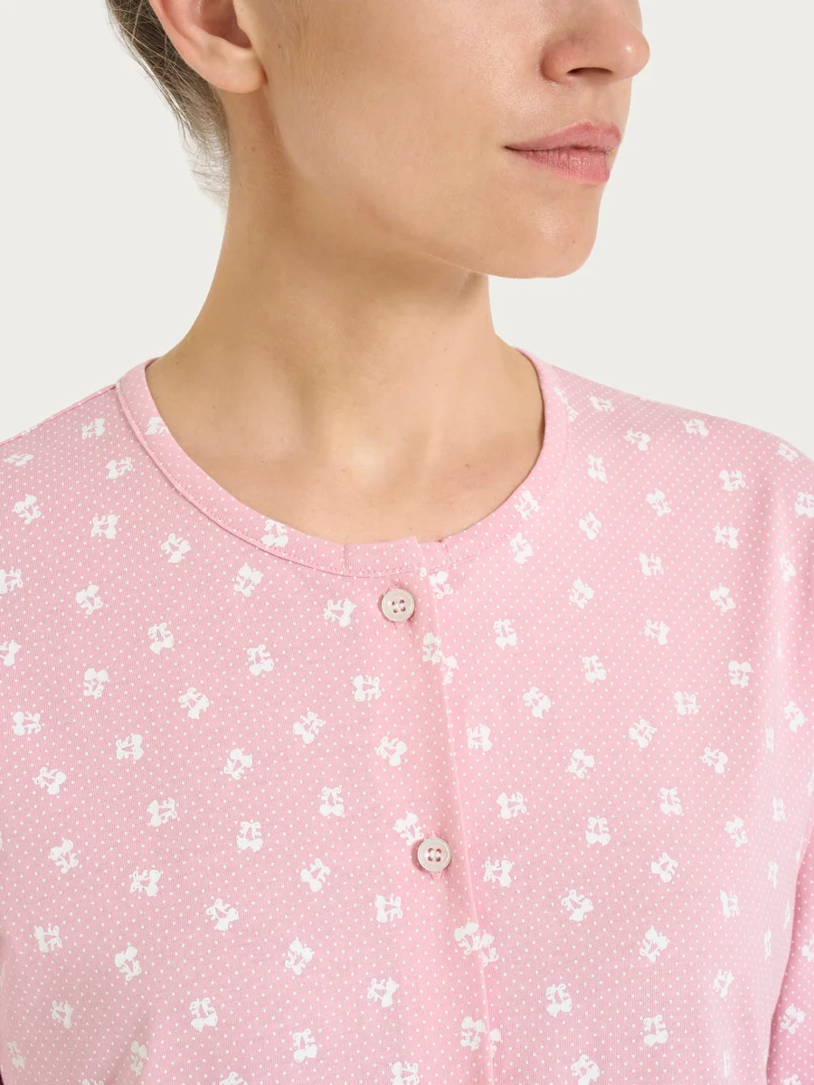 Il modello presenta un girocollo con apertura a bottoncini, che definisce la scollatura con semplicità ed eleganza. La manica lunga è rifinita da una chiusura con bottoncino, un dettaglio pratico e femminile che completa il design con discrezione.