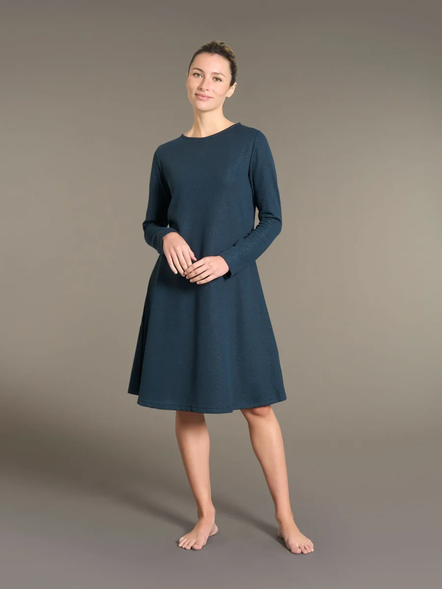 Con il suo elegante collo a barchetta, la manica lunga e una lunghezza fino al ginocchio (100 cm nella taglia 2) è presentata in delicati colori tinta unita per un aspetto raffinato e chic, ma anche semplice e comodo.