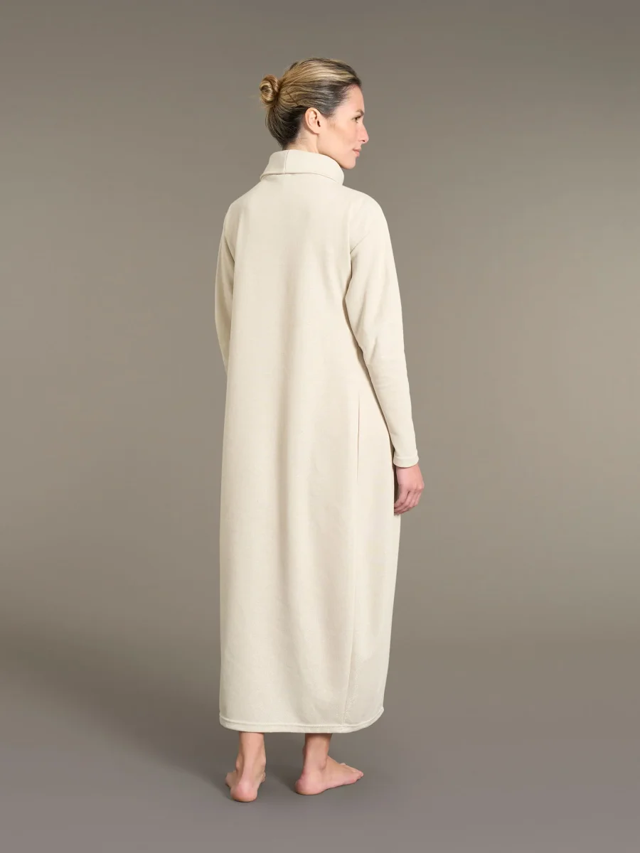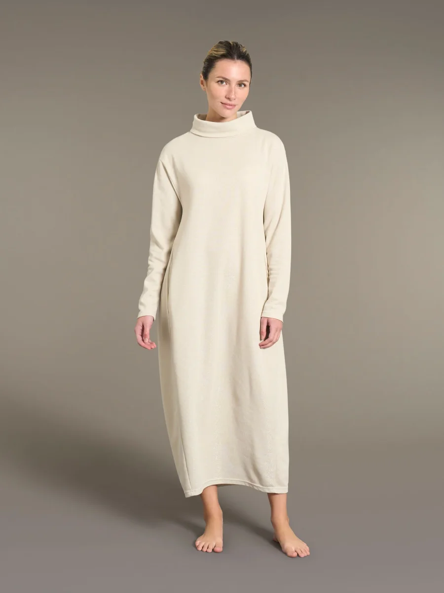 Con il suo elegante collo alto, la manica lunga e lunghezza alla caviglia (125 cm nella taglia 2) è presentata in delicati colori tinta unita per un aspetto raffinato e chic, ma anche semplice e comodo.