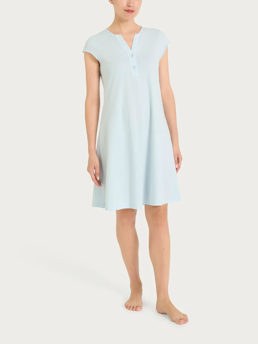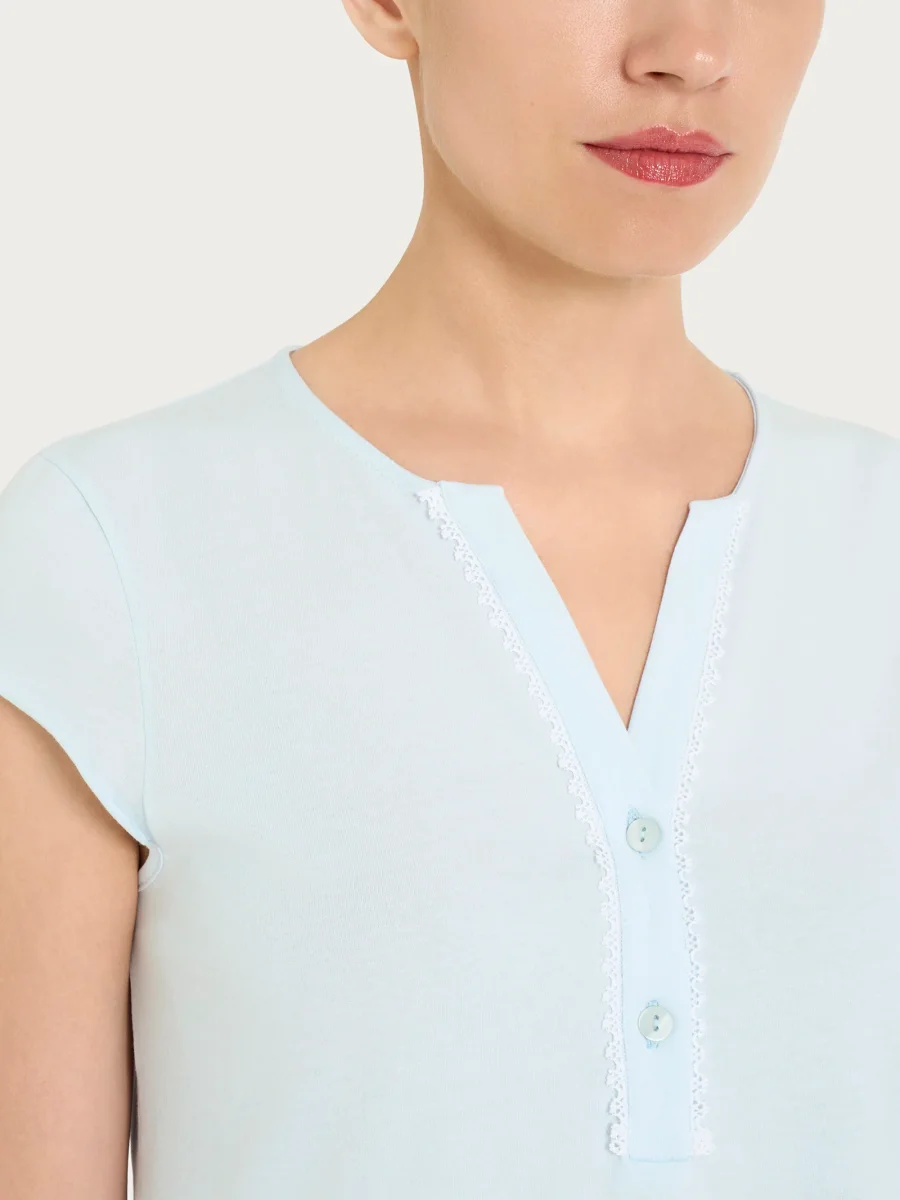 Il modello è in tinta unita e presenta un collo a serafino con bottoncini, che definisce la scollatura con una linea pulita e curata, pratica da indossare e sempre femminile. La manica corta la rende perfetta per la stagione calda, garantendo leggerezza e libertà di movimento durante la notte.
