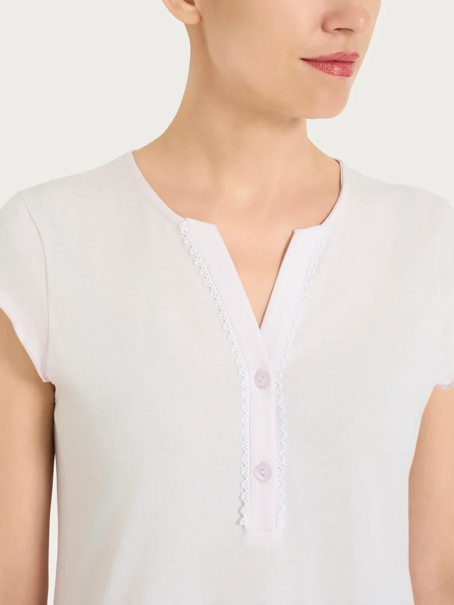 Il modello è in tinta unita e presenta un collo a serafino con bottoncini, che definisce la scollatura con una linea pulita e curata, pratica da indossare e sempre femminile. La manica corta la rende perfetta per la stagione calda, garantendo leggerezza e libertà di movimento durante la notte.