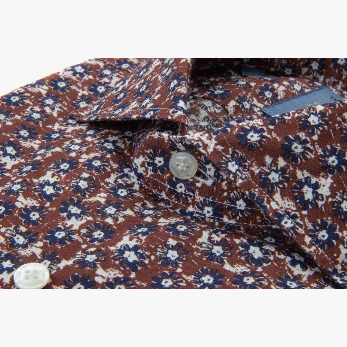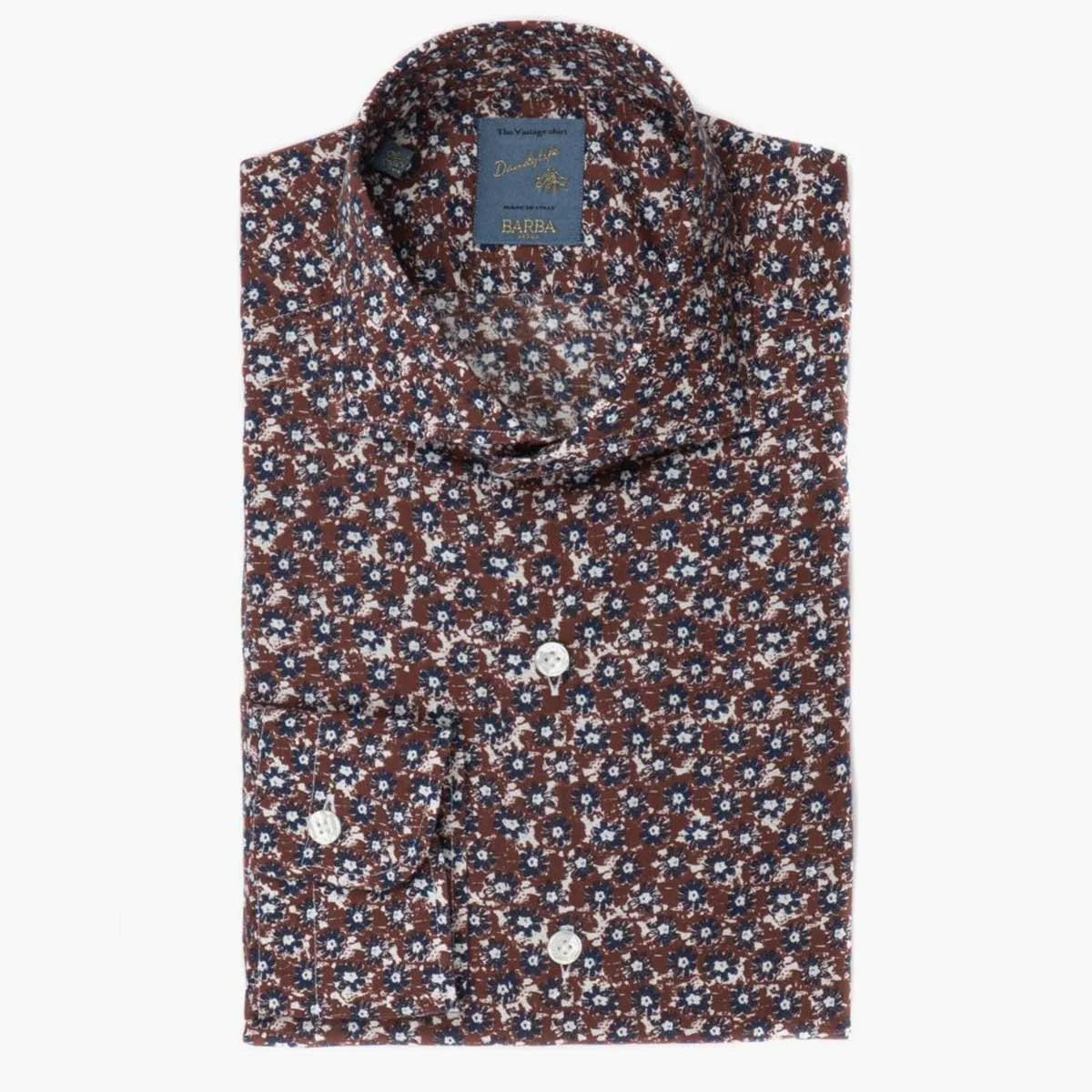 Camicia linea DANDY LIFE, cucita a mano, colore mattone con fantasia multiucolor riprese posteriori, polso rotondo, bottoni in madreperla.