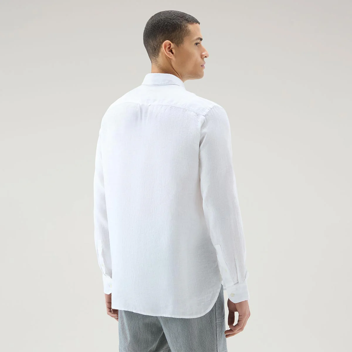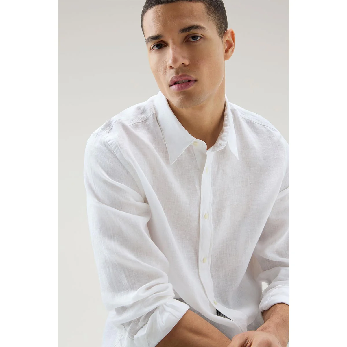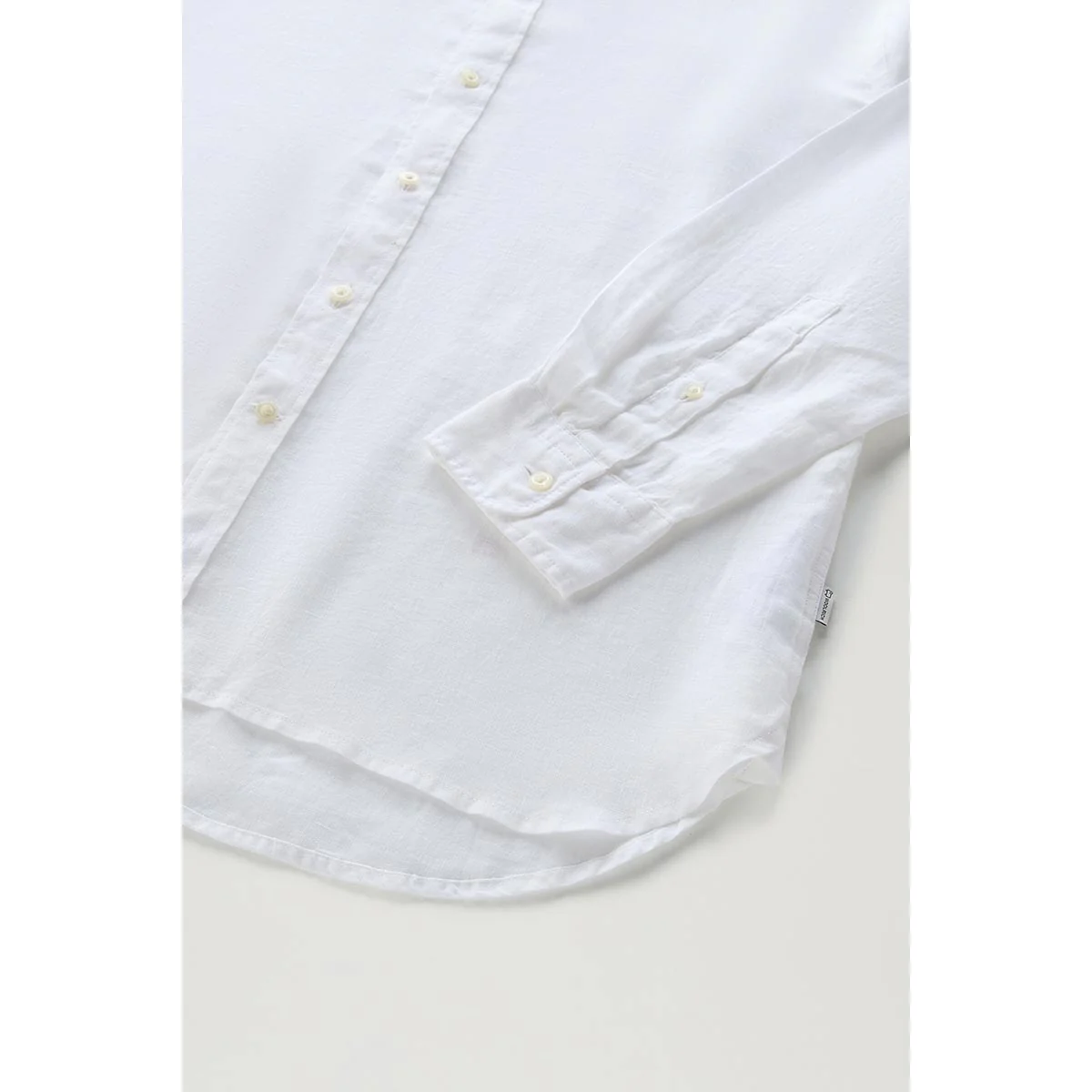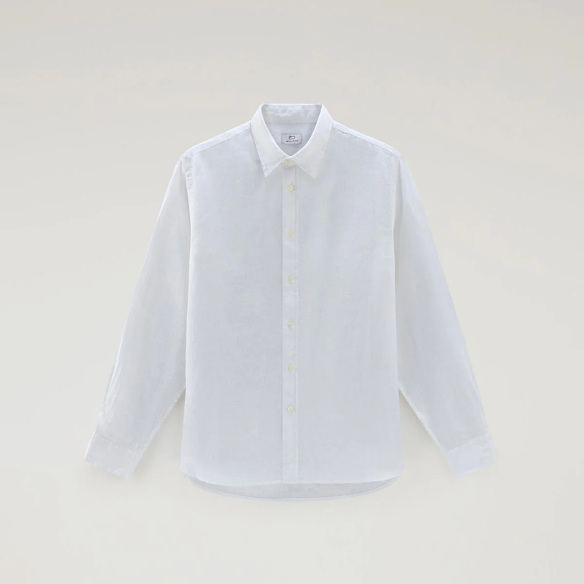 Camicia colore bianca leggera e fresca realizzata in puro lino, è tinta in capo per una finitura unica. Ha il classico colletto a punta, chiusura con bottoni, polsini abbottonati e fondo arrotondato.