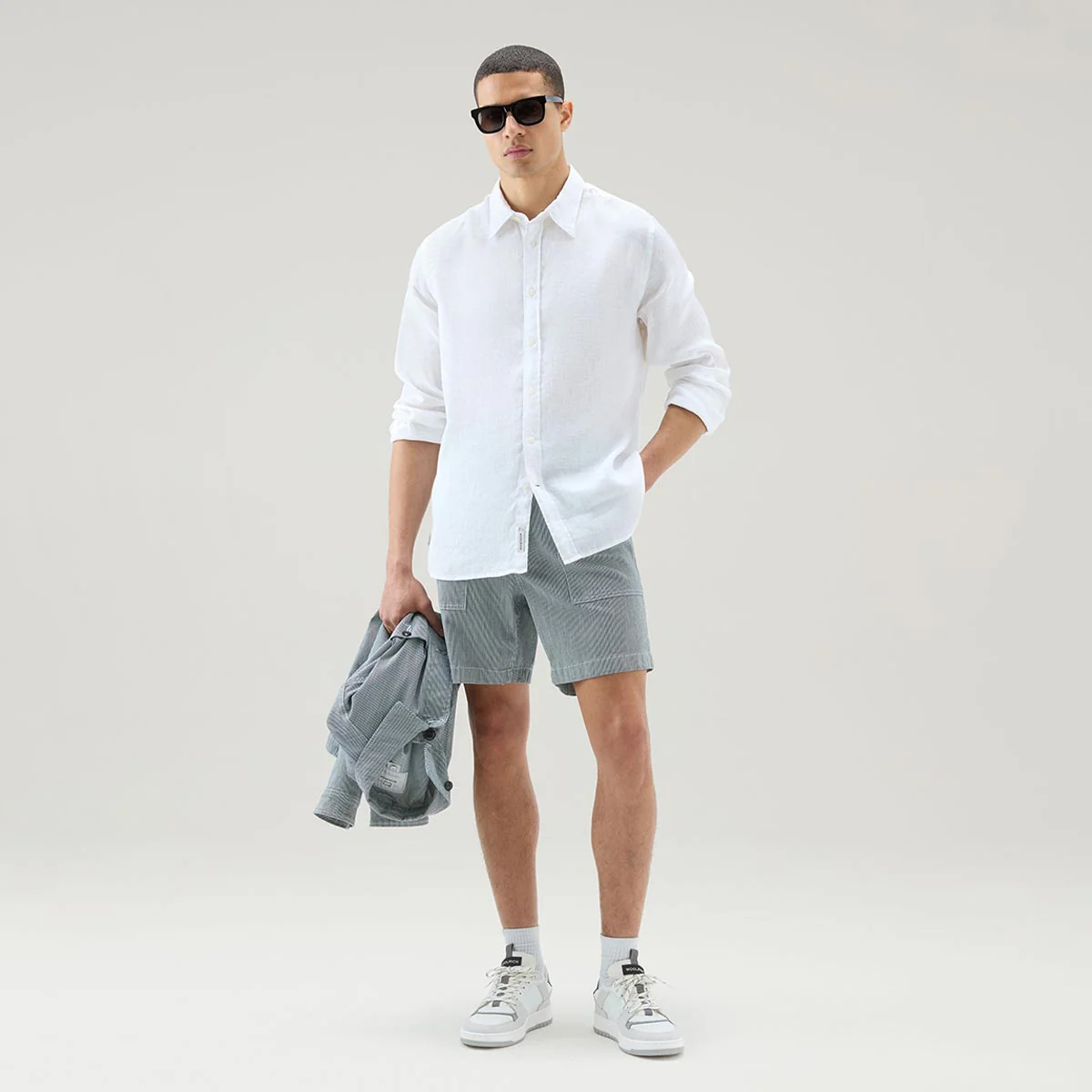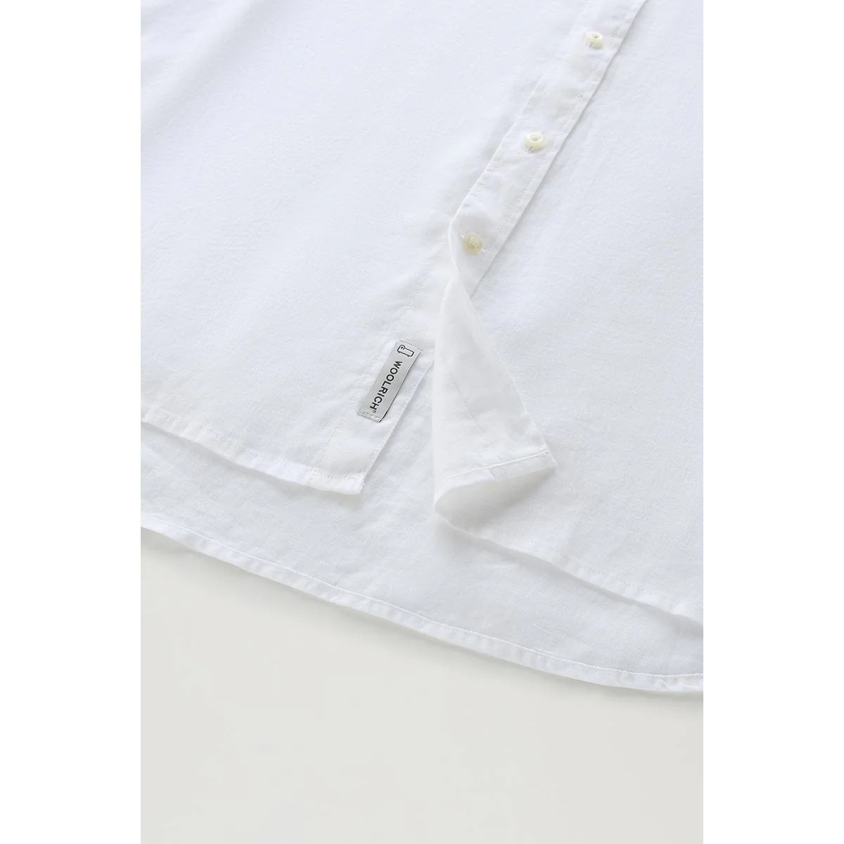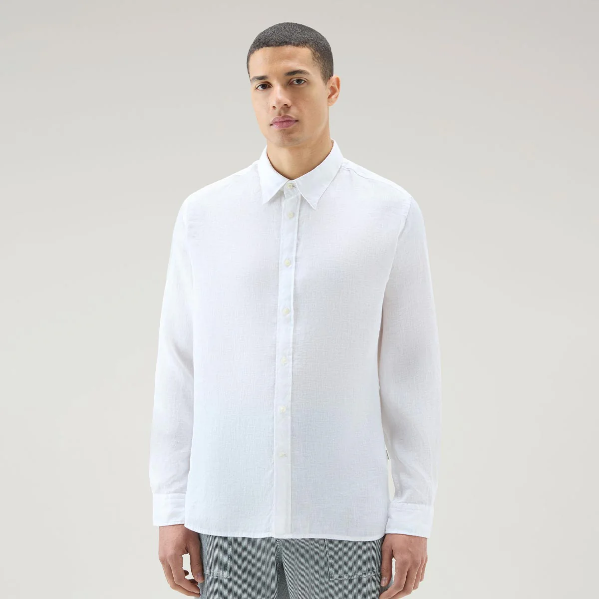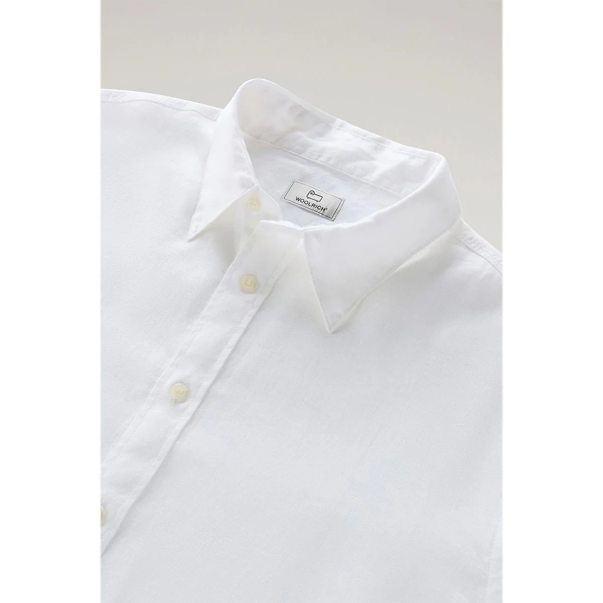 Camicia colore bianca leggera e fresca realizzata in puro lino, è tinta in capo per una finitura unica. Ha il classico colletto a punta, chiusura con bottoni, polsini abbottonati e fondo arrotondato.