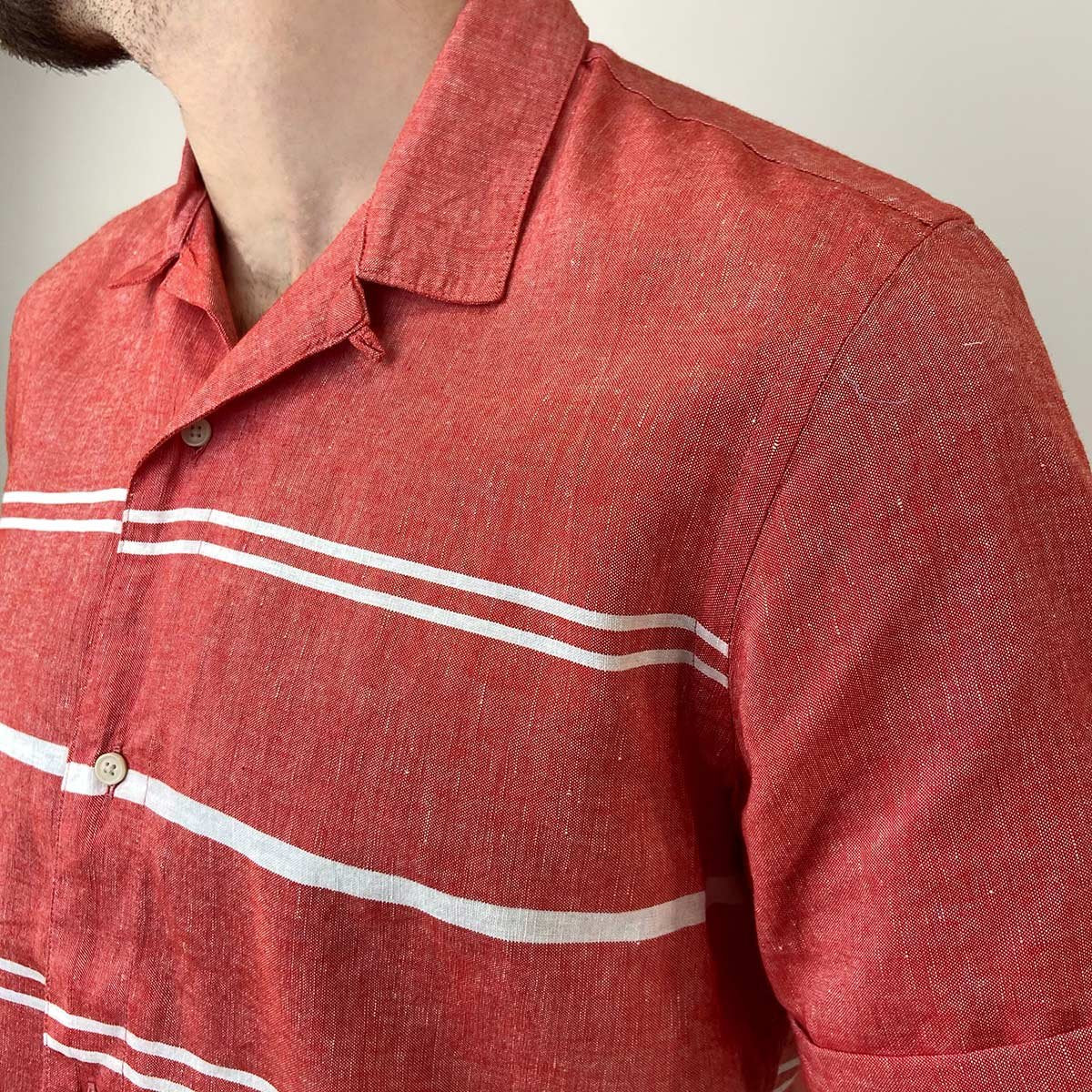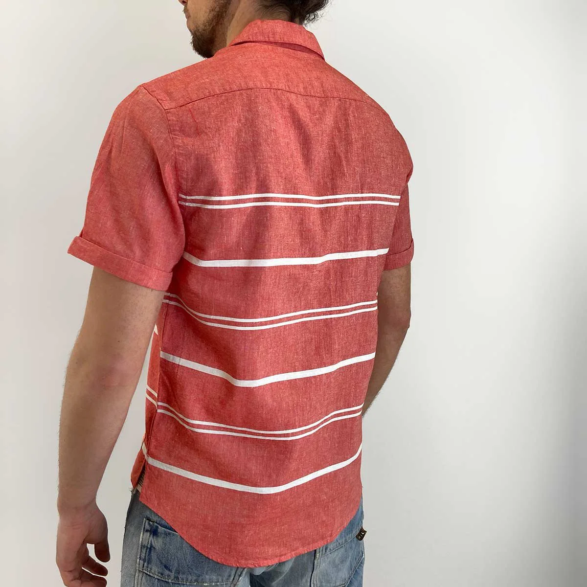 Camicia in lino rossa righe bianche. Modello con colletto reverse, abbottonatura frontale, manica corta.