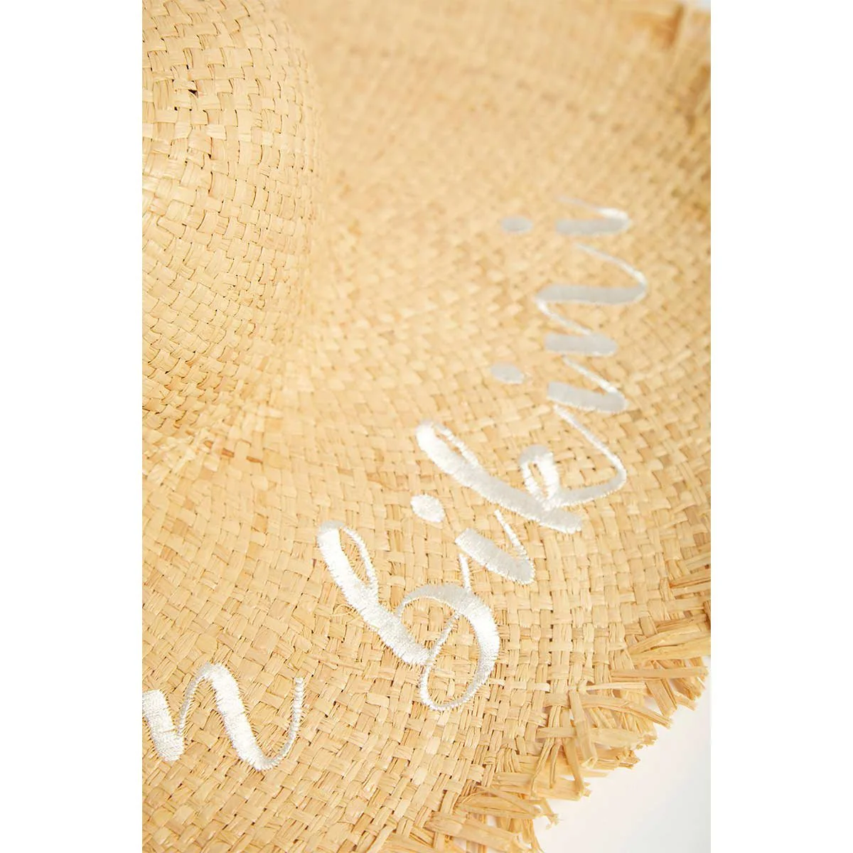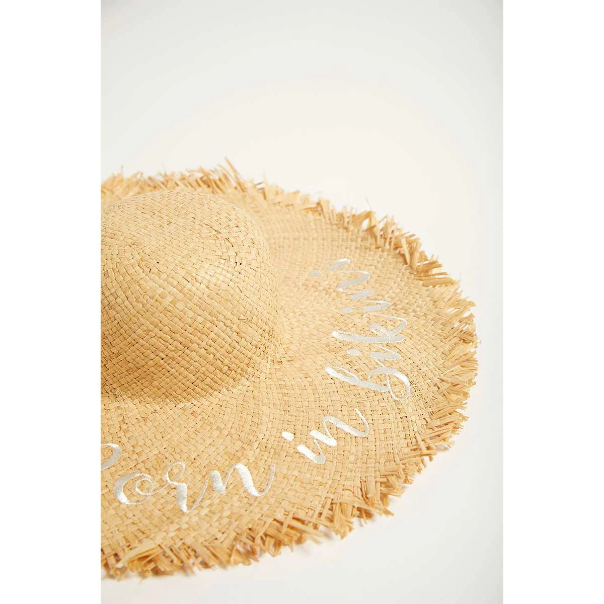 Cappello naturale da donna forma a tesa larga, ricamo bianco “Born in bikini”.
