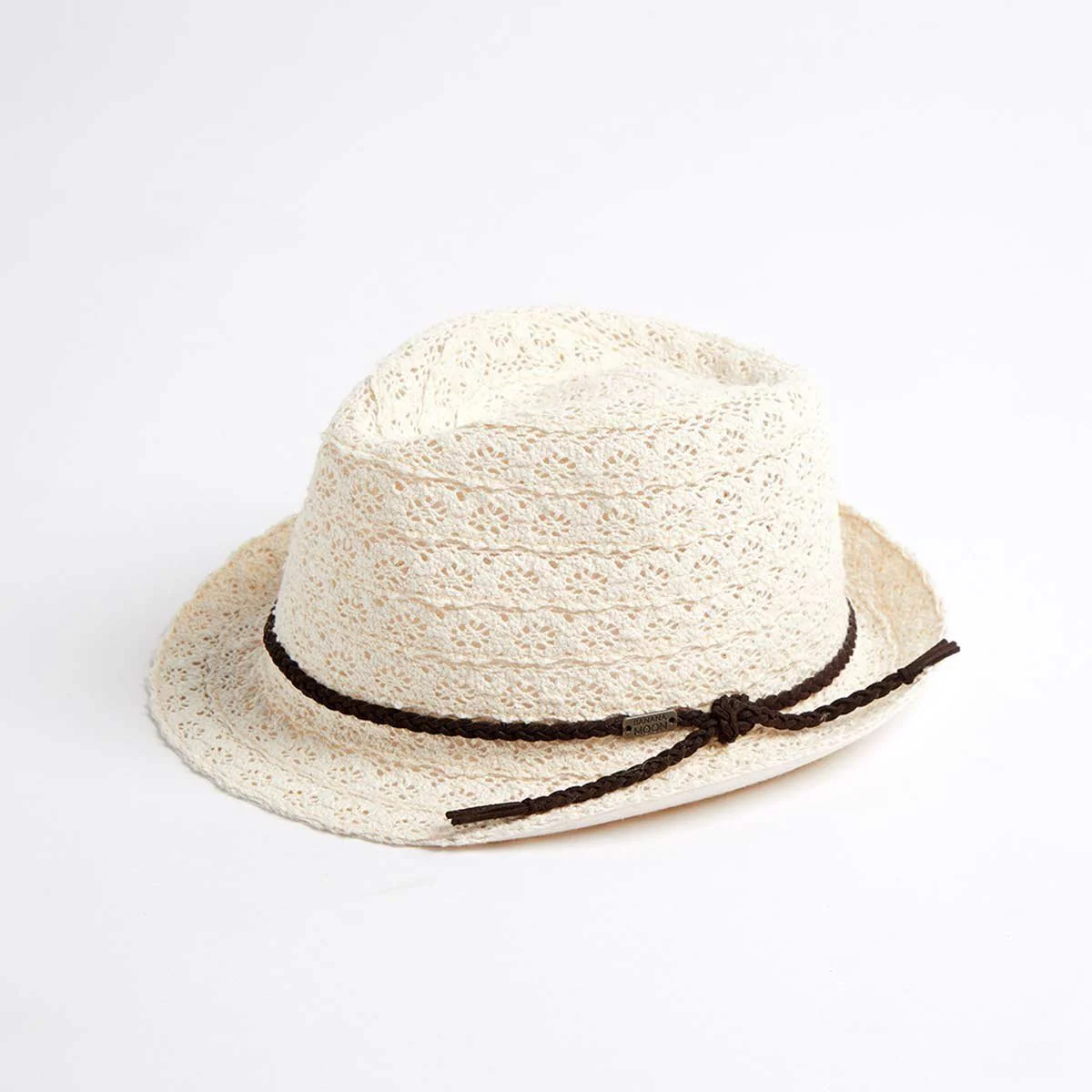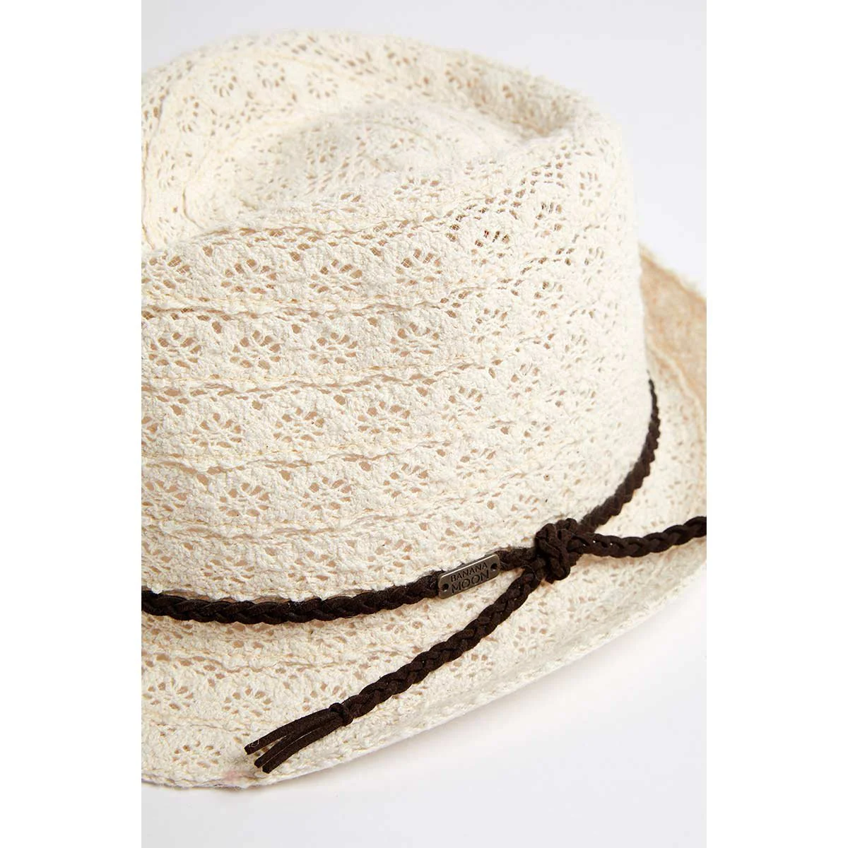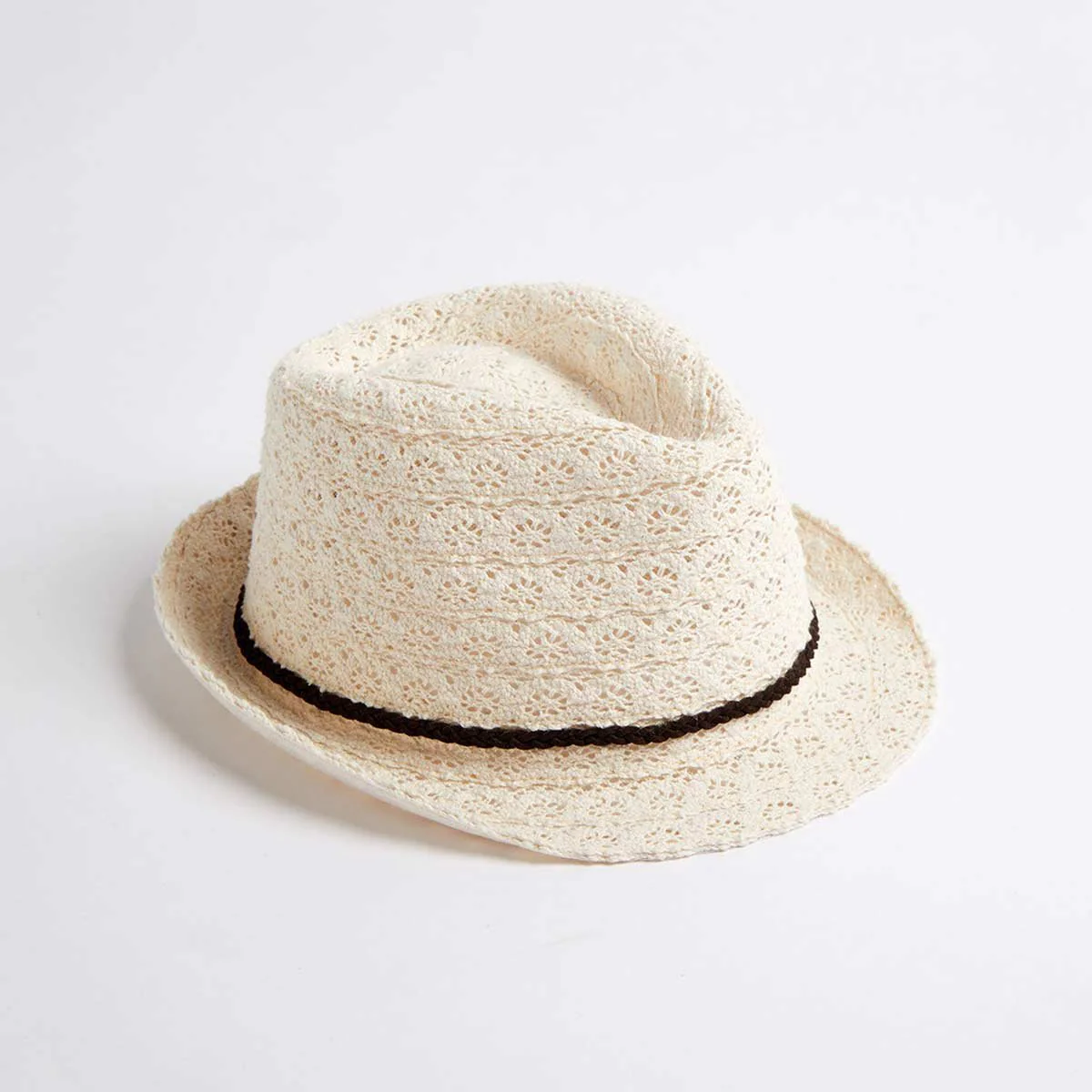 Cappello donna lavorato in pizzo con bordino intrecciato beige.