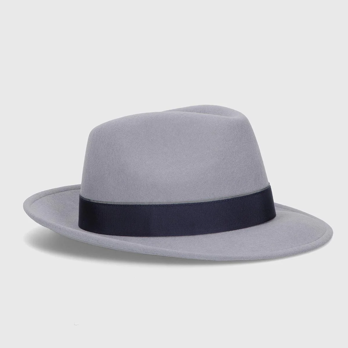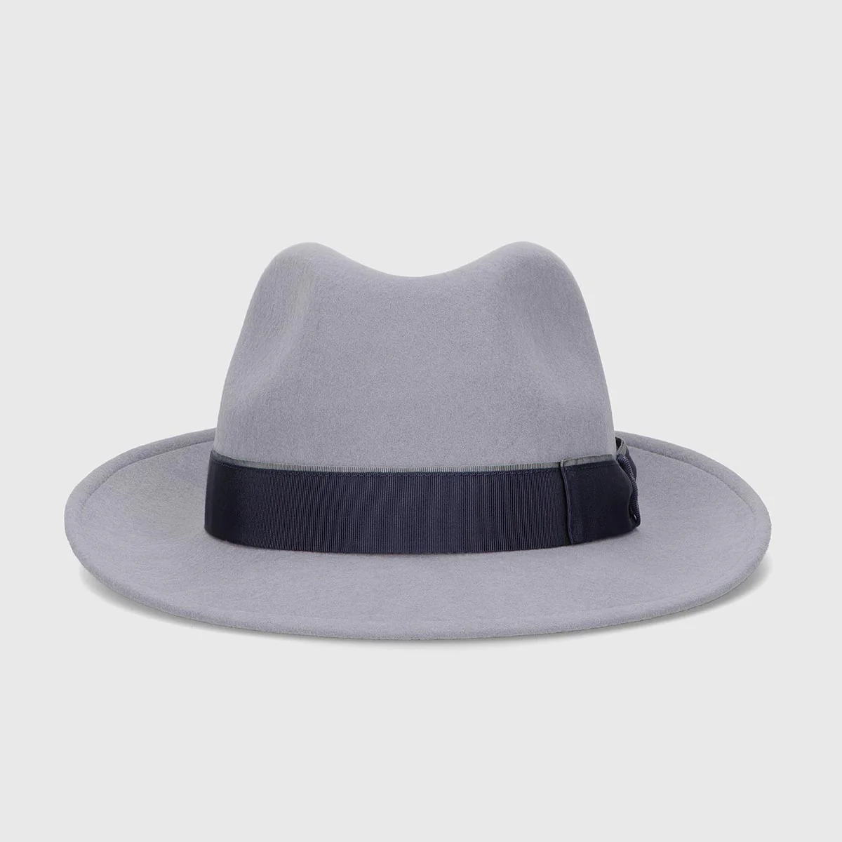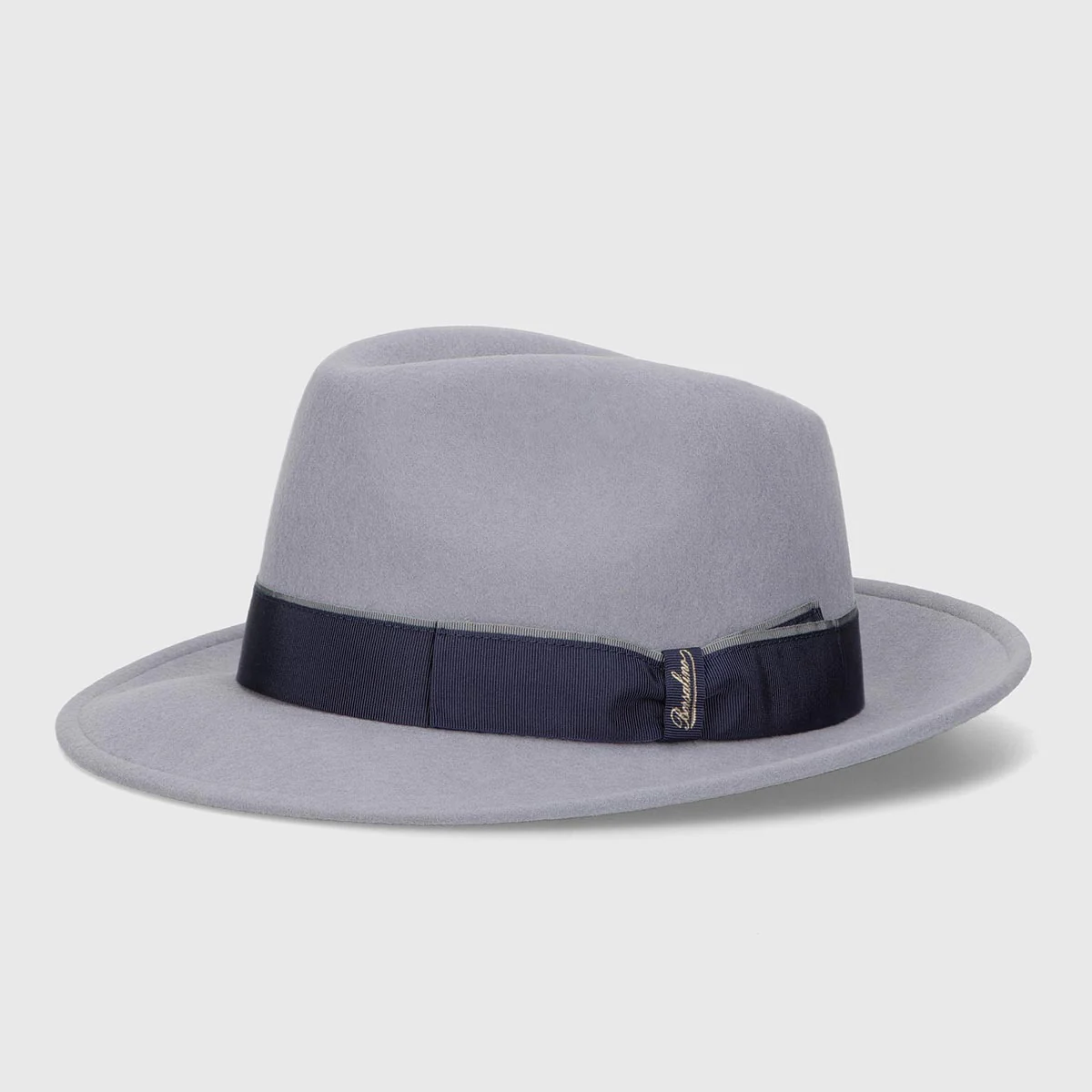 Cappello realizzato è realizzato in feltro di lana sfoderato ed offre una vestibilità leggera e confortevole, ha una tesa media di 6 cm con una cinta bicolore in canneté a contrasto di 3 cm e arricchita dal logo Borsalino.