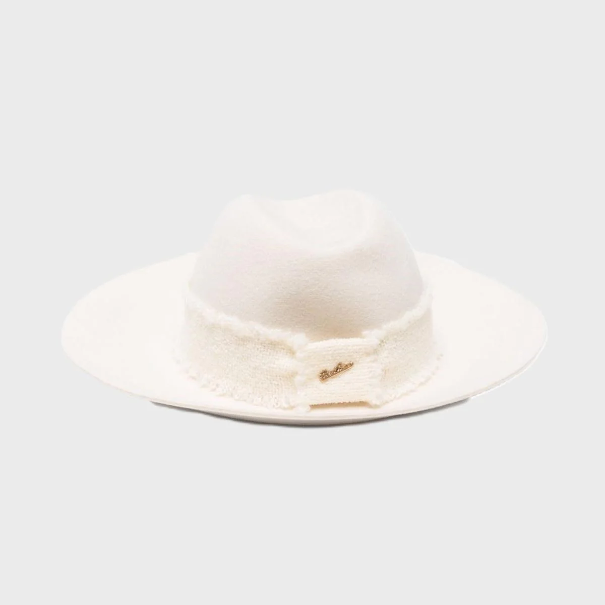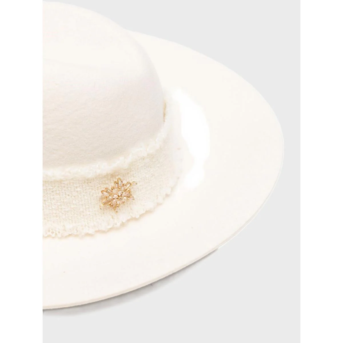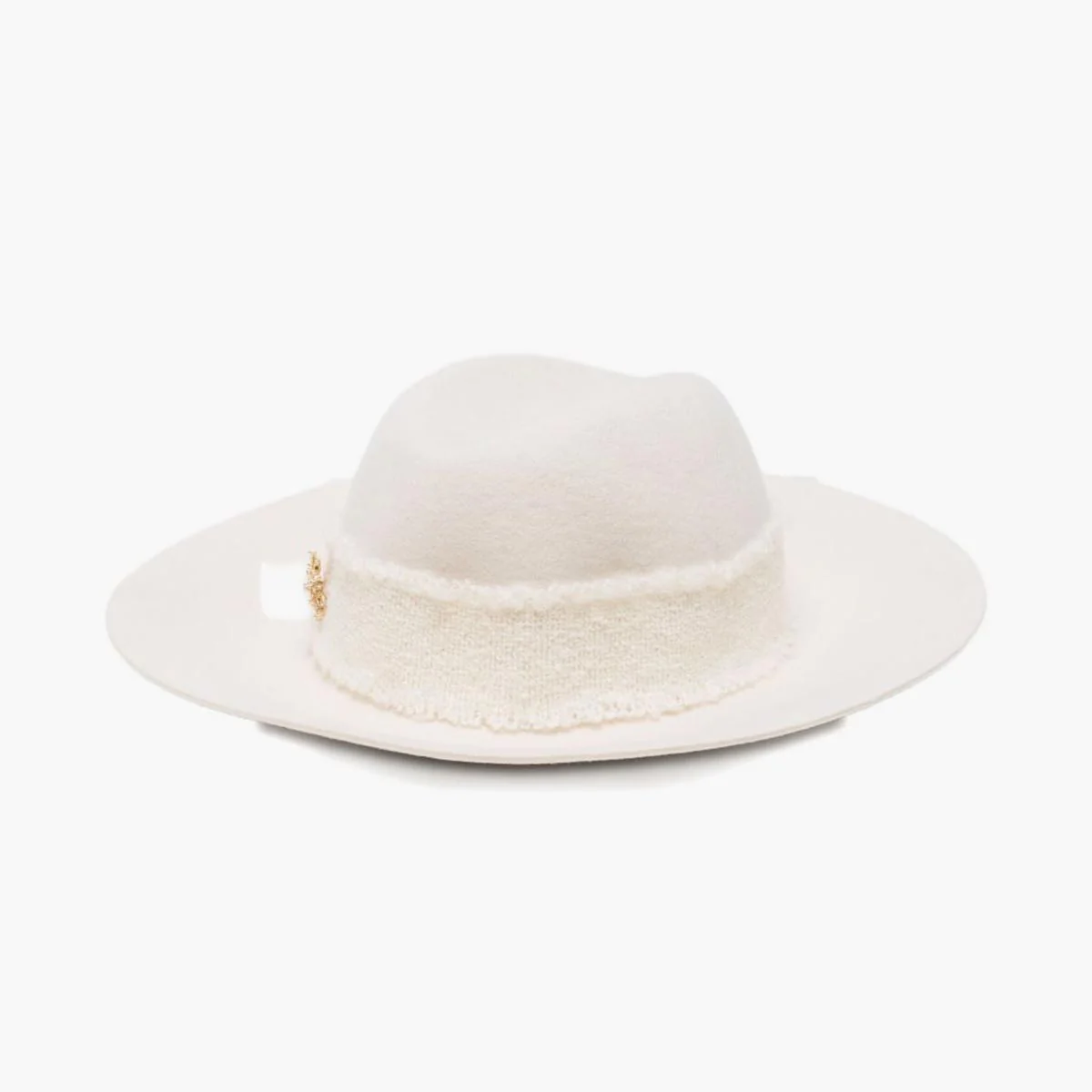 Cappello sfoderato per una vestibilità leggera e naturale. La cinta in bouclé da 4 cm è chiusa sul retro e arricchita da una spilla a forma di fiocco di neve e da un mini logo in metallo galvanizzato, entrambi posizionati sul retro per un effetto raffinato e discreto. La tesa larga, di circa 8,5 cm