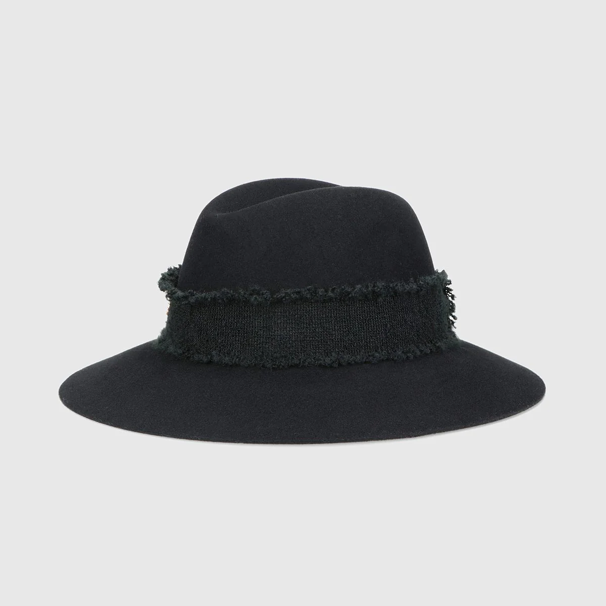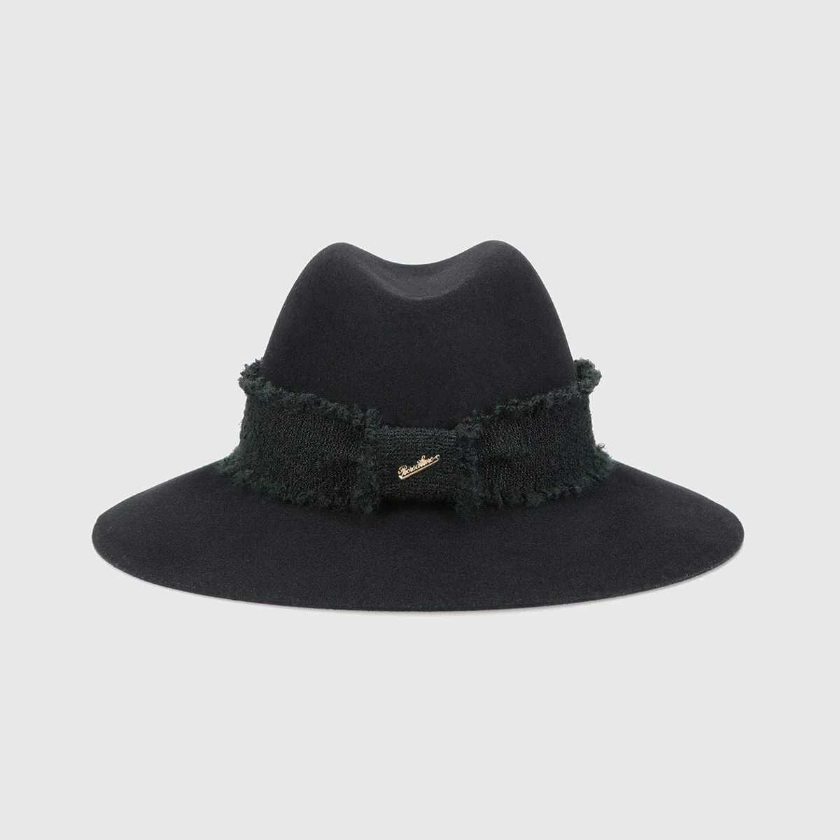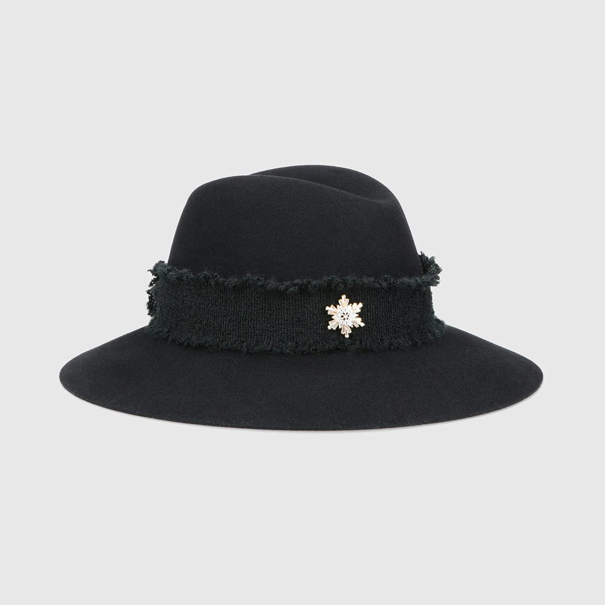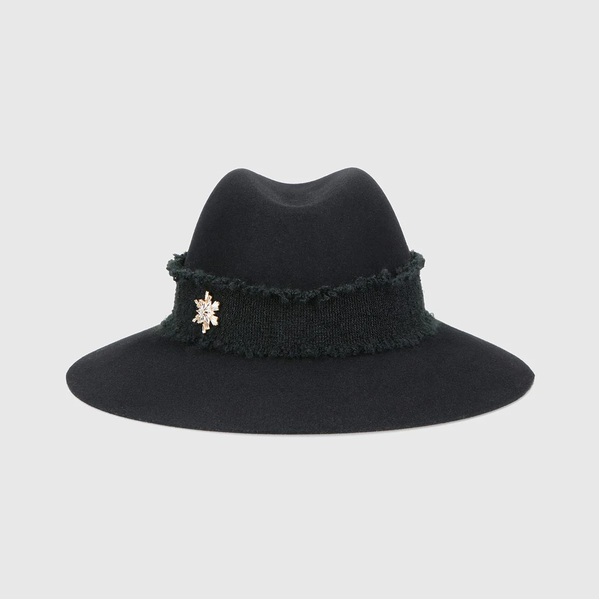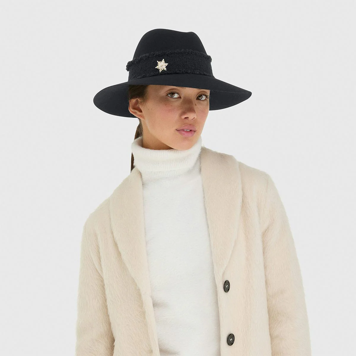 Cappello sfoderato per una vestibilità leggera e naturale. La cinta in bouclé da 4 cm è chiusa sul retro e arricchita da una spilla a forma di fiocco di neve e da un mini logo in metallo galvanizzato, entrambi posizionati sul retro per un effetto raffinato e discreto. La tesa larga, di circa 8,5 cm