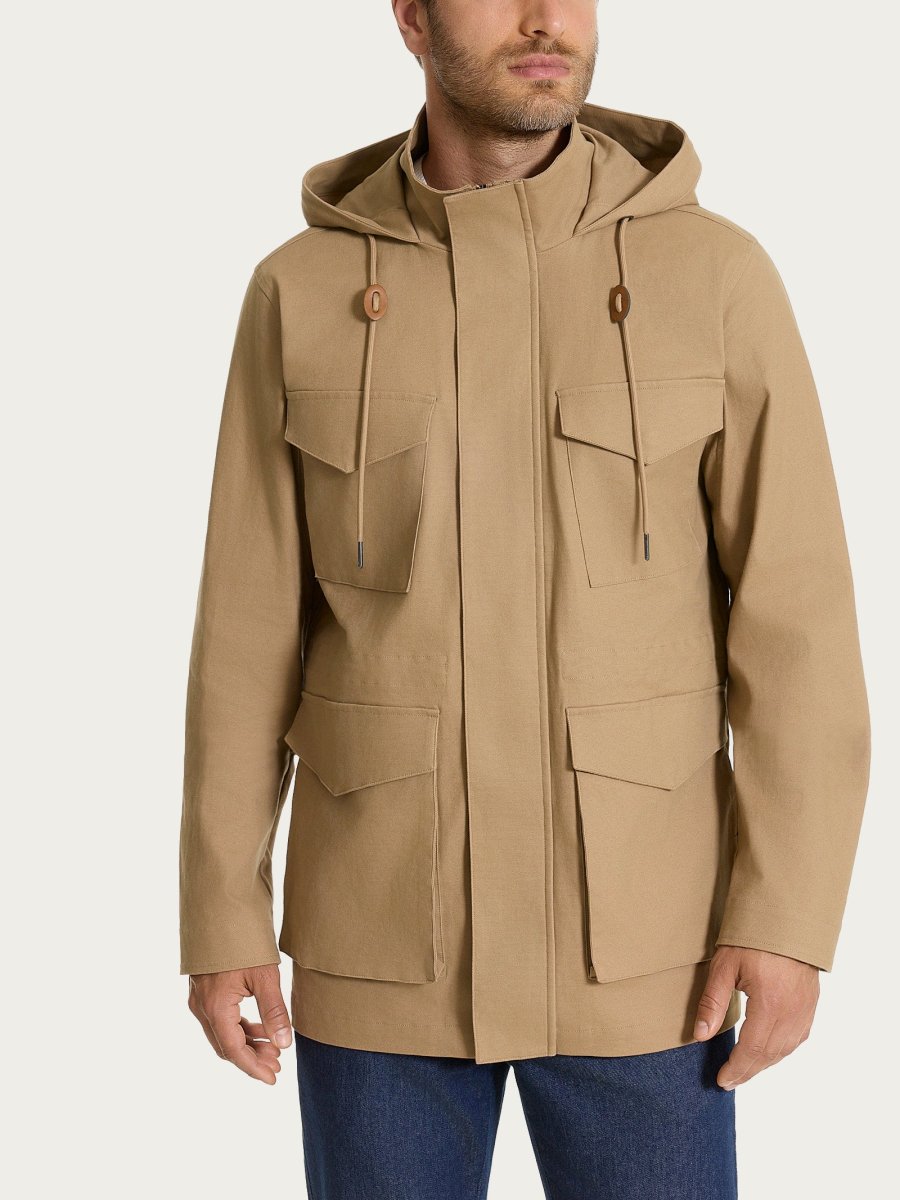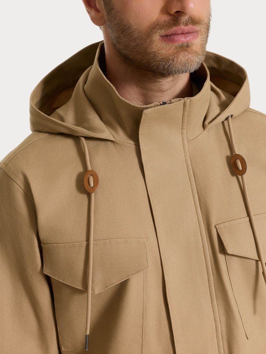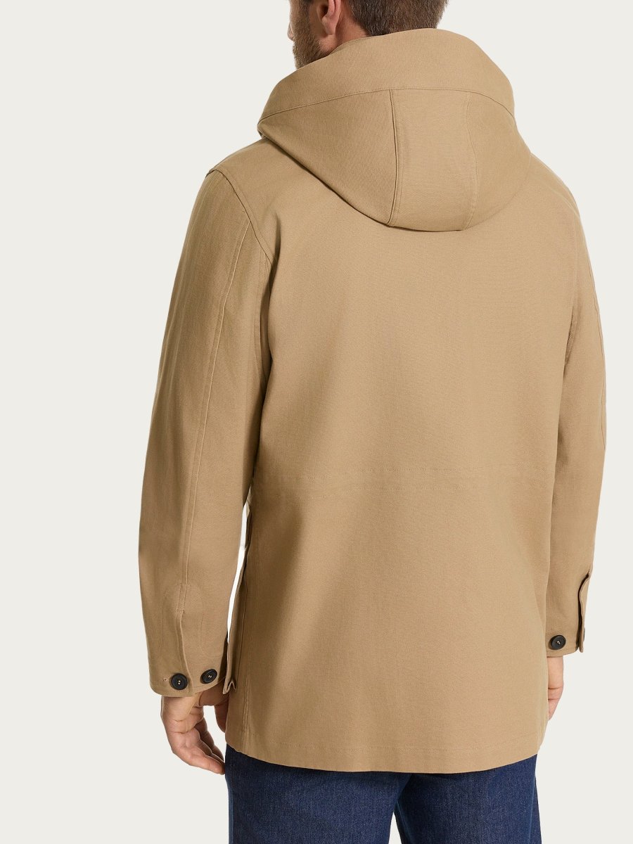 Cappotto da uomo in Canvas Stretch con cappuccio, pensato per unire funzionalità e stile in un capospalla pratico e contemporaneo.