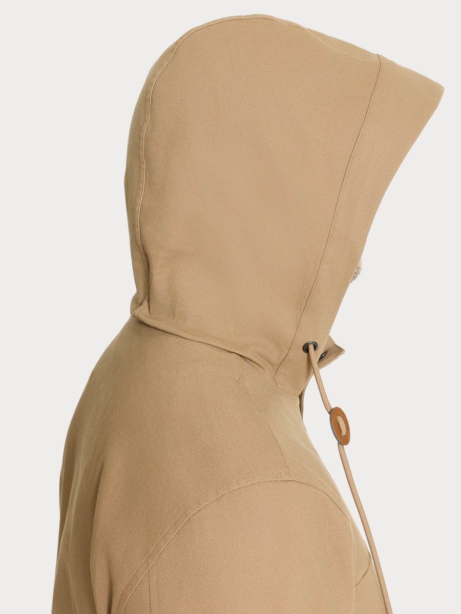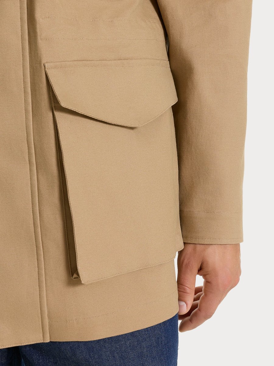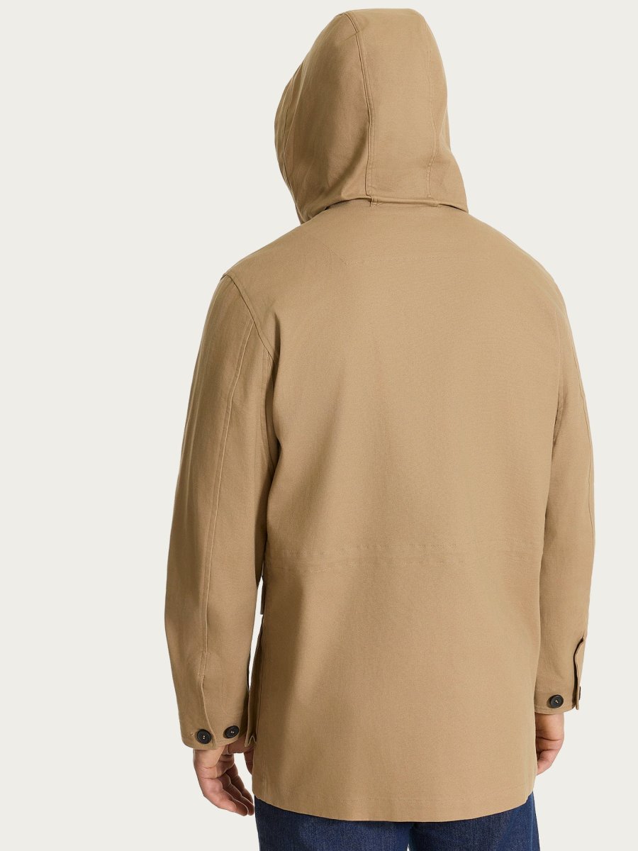 Cappotto da uomo in Canvas Stretch con cappuccio, pensato per unire funzionalità e stile in un capospalla pratico e contemporaneo.