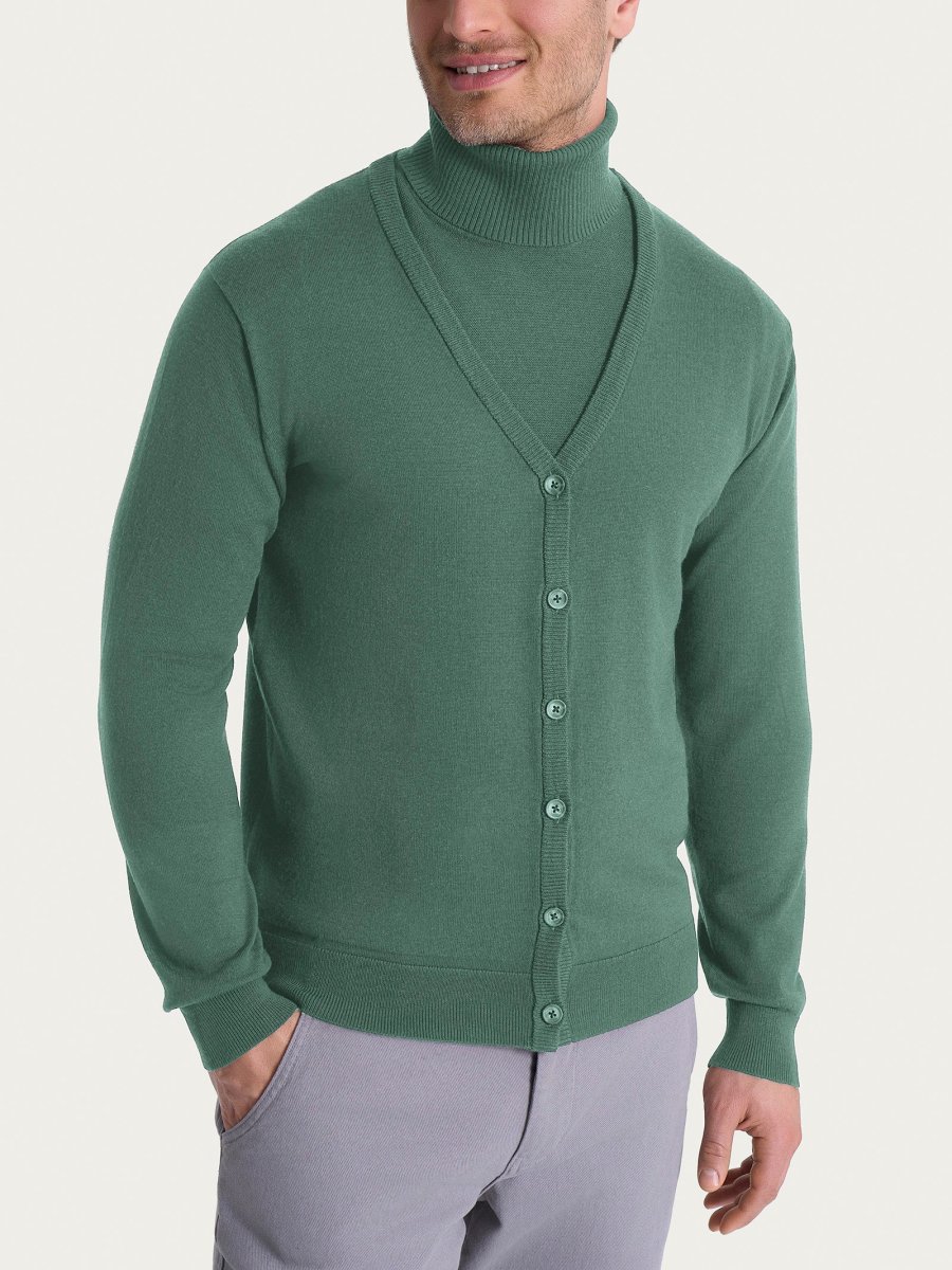 Cardigan con scollo a V da uomo in pura lana merino, tessuto in finezza 12, estremamente morbido e caldo.