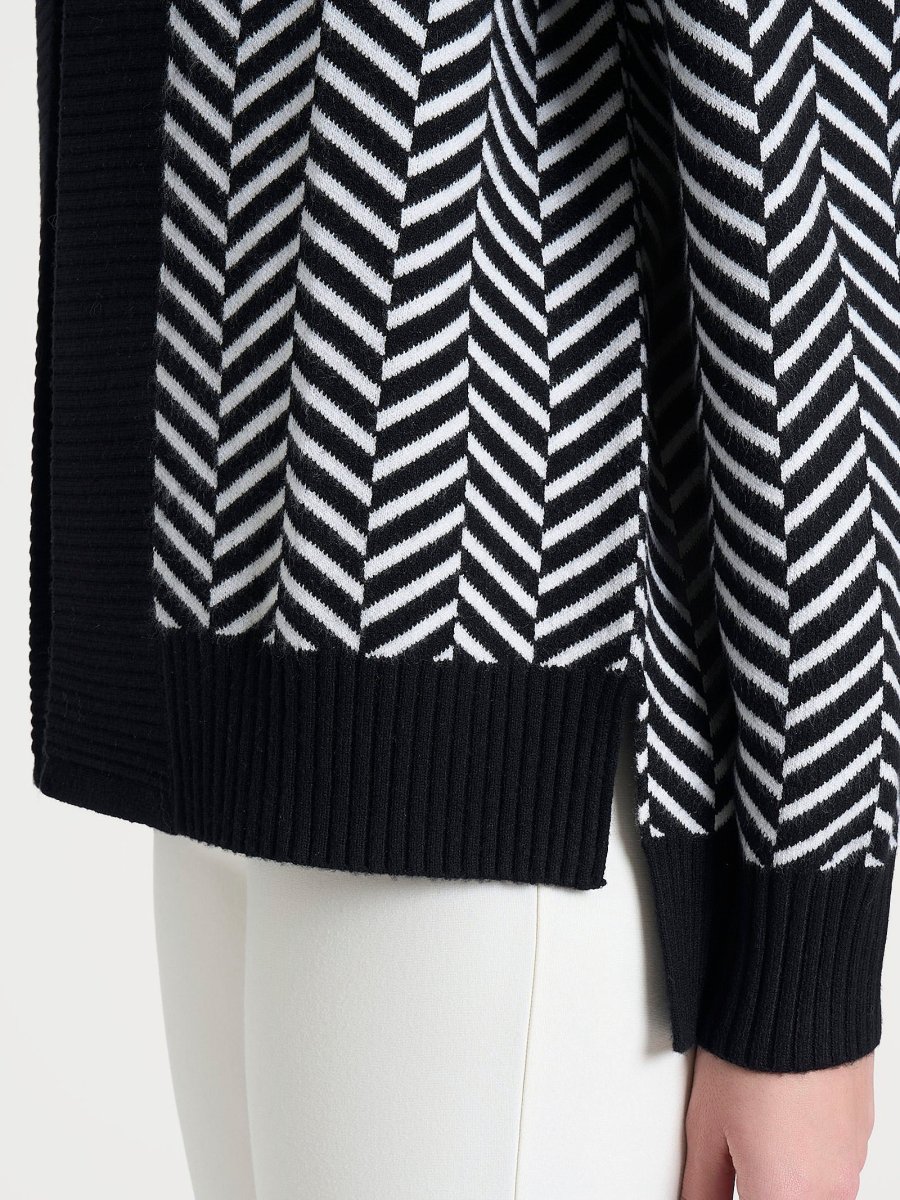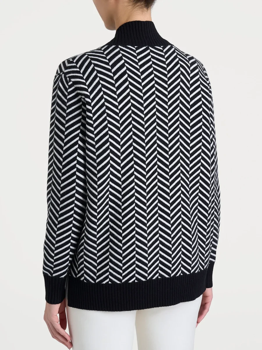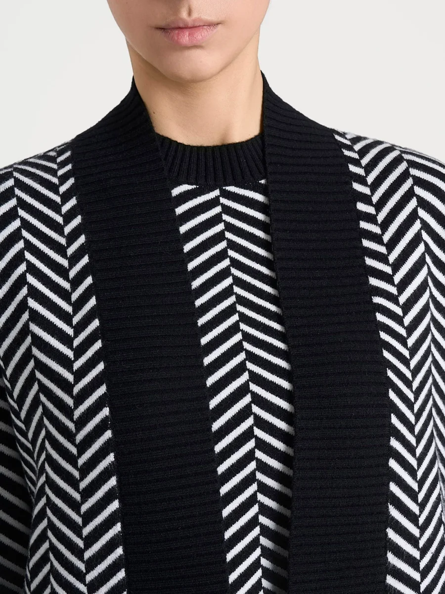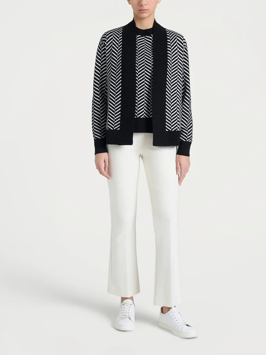 La bordatura in costina 3×3 in tinta unita crea un contorno netto e definito, offrendo un elegante contrasto che valorizza l’intero capo.