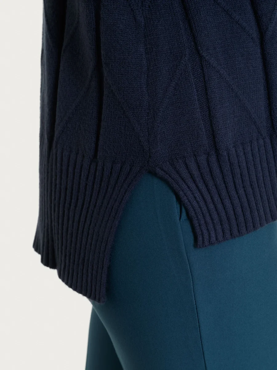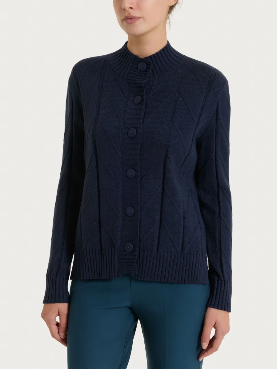 Questo cardigan aperto con collo alto lupetto scende dolcemente lungo i fianchi, creando una linea fluida che valorizza la silhouette con un look semplice ma elegante.