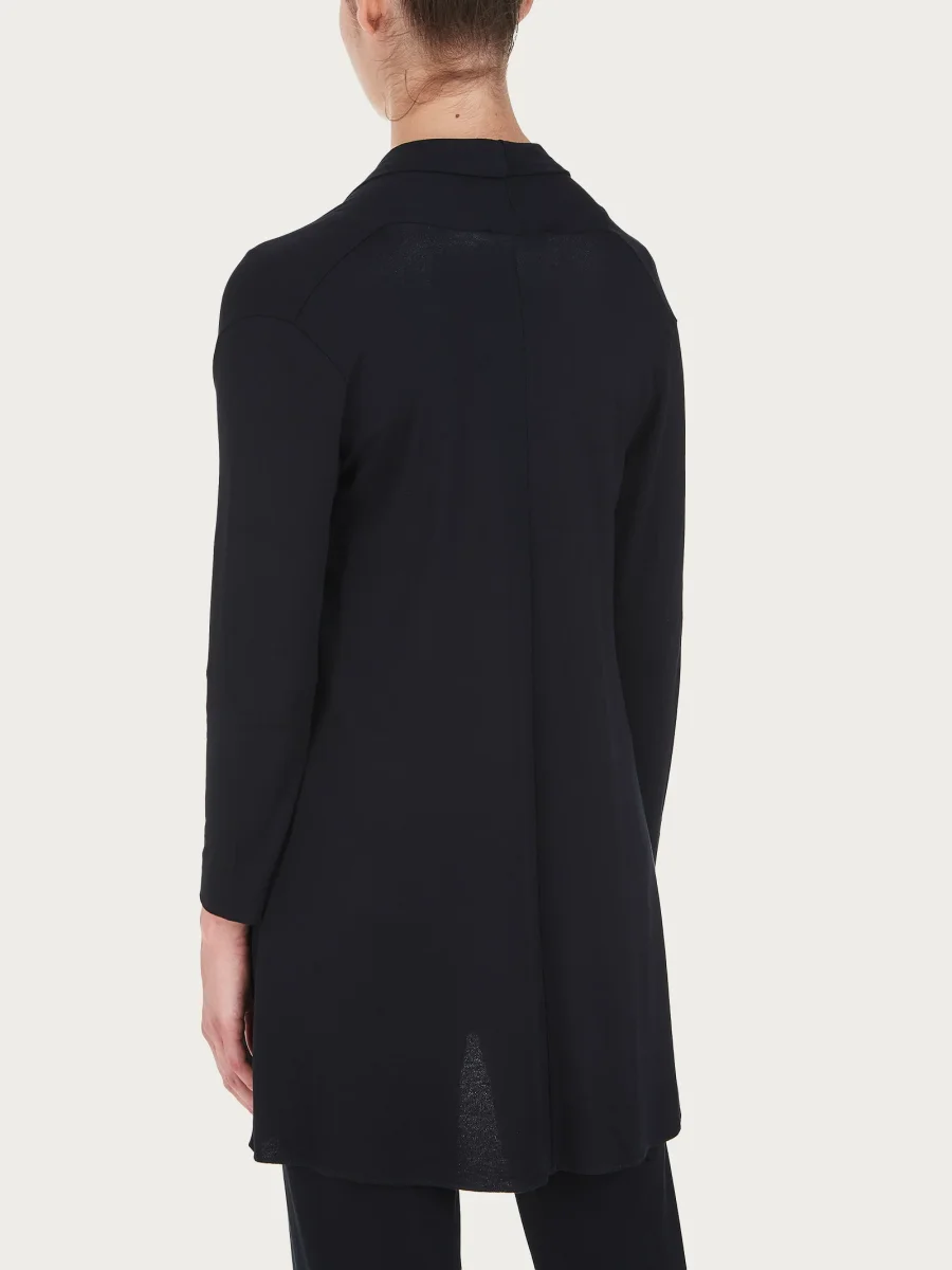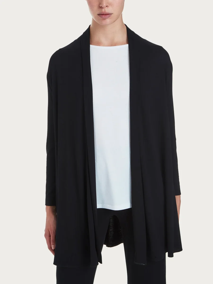 Cardigan lungo aperto donna in jersey di viscosa crêpe, un tessuto incredibilmente fresco e cascante realizzato con filati ad alta torsione che conferiscono una mano nervosa e increspata bilanciata dalla morbidezza della viscosa, una fibra naturale e traspirante.